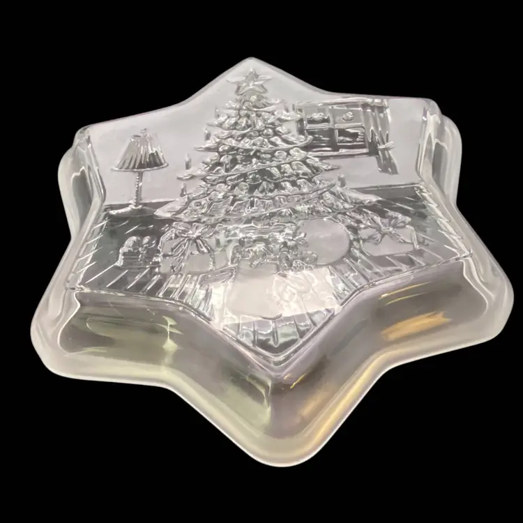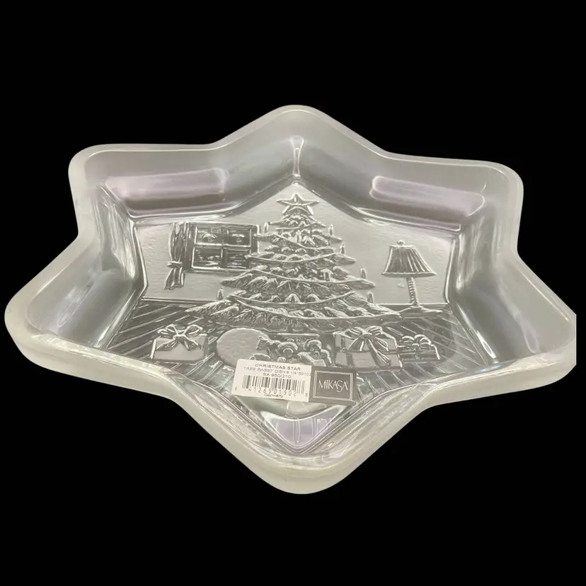 This Mikasa Christmas-themed serving sweet dish is a vintage candy dish made in West Germany. This decorative piece features a star-shaped design with a glossy and frosted finish, perfect for serving holiday treats. New with label attached/no box Hand wash No cracks or chips.