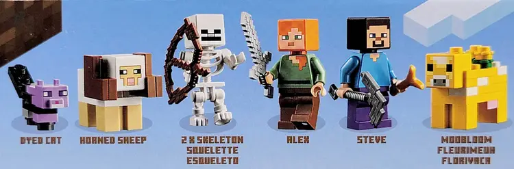 Set Includes a MooBloom, the overworld and two mine levels based on the Minecraft Earth video game, four minifigures, a purple cat, a MooBloom, and a ram.
