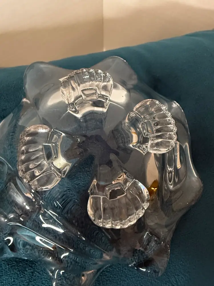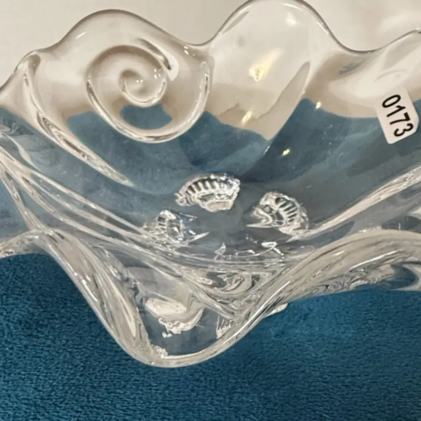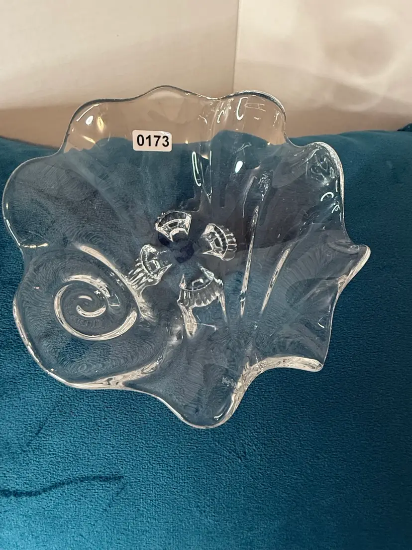 5x2 The style is characteristic of mid-century modern or "Space Age" Italian art glass. clear pressed art glass bowl with a flowing ruffled edge, swirl accents, and four molded feet. Heavy, brilliant glass with an artistic freeform shape. No cracks scratches or chips