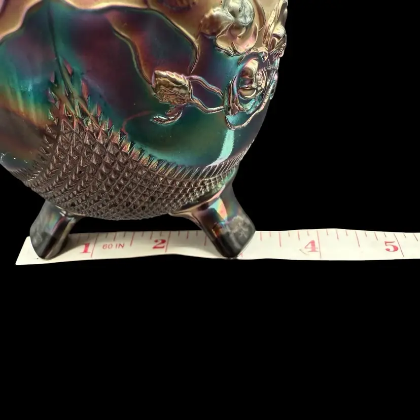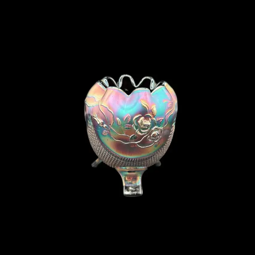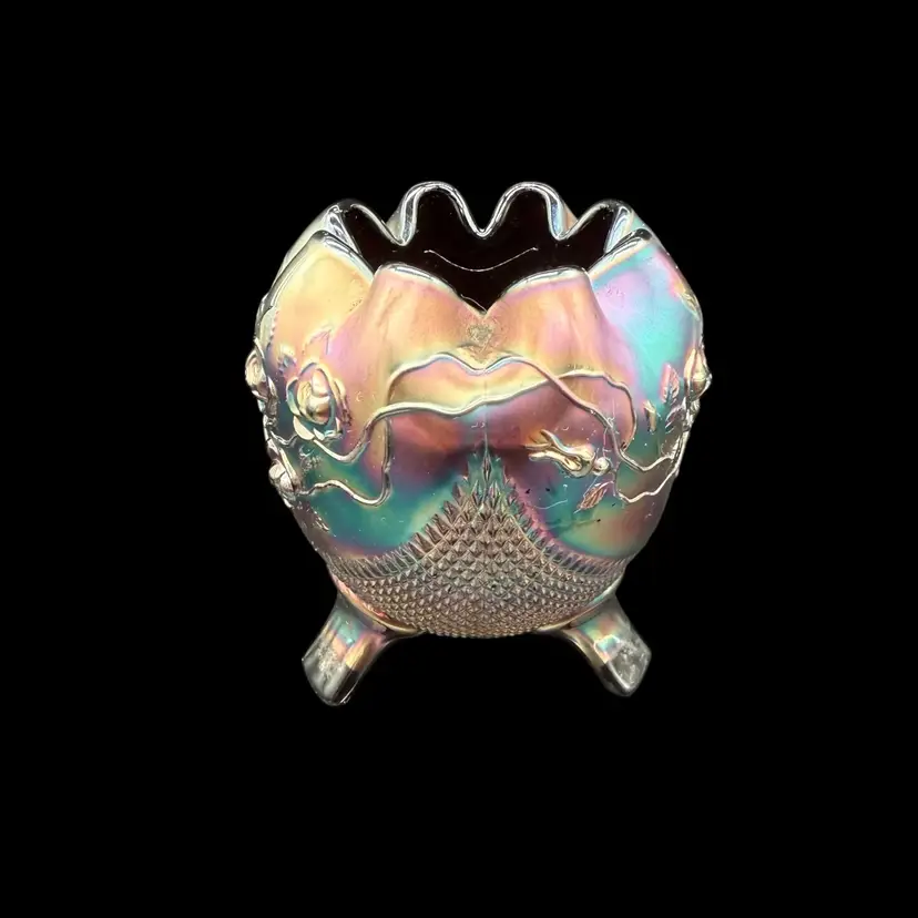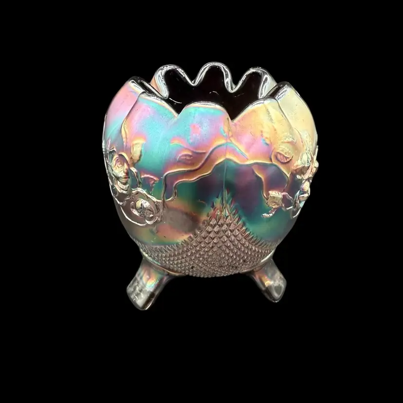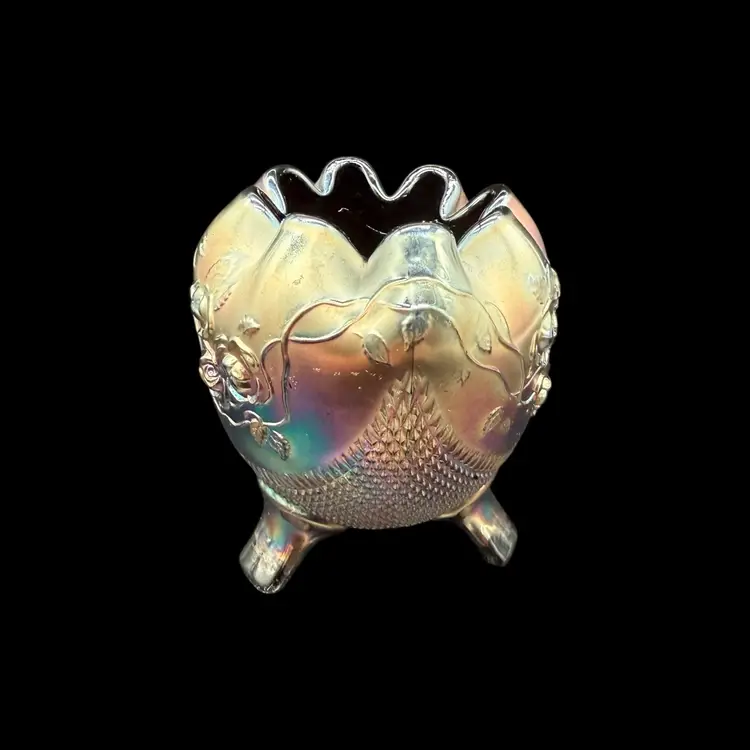 The Northwood Amethyst Fine Cut & Roses Variant Carnival Glass RoseBowl Antique is a stunning piece of art glass originating from the United States. Featuring a floral & diamond point pattern in a dark purple color, this vintage vase is crafted from carnival glass with a stunning iridescent finish. The Art Nouveau style of this decorative piece makes it a collectible item perfect for glass collectors, and the variant (no bottom circular ring) is less common and gives the piece a more polished overall look.