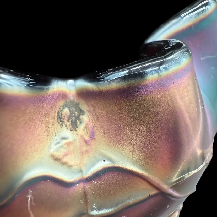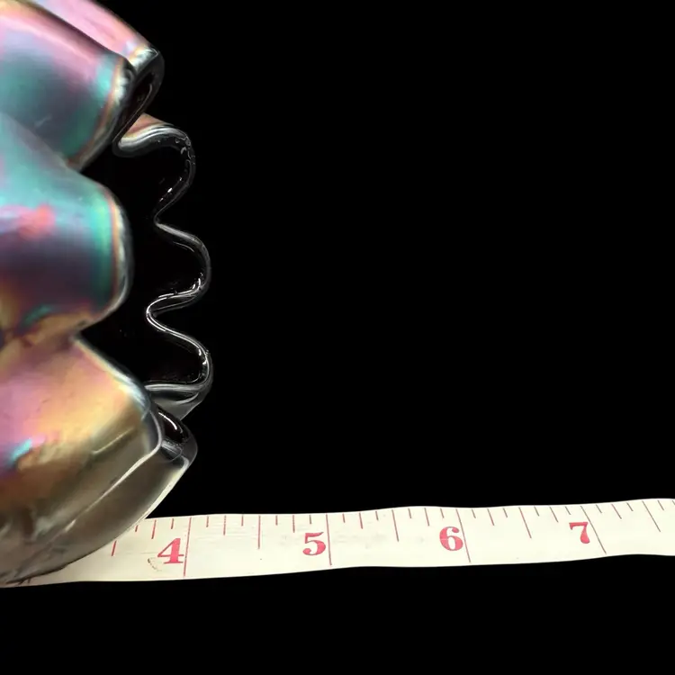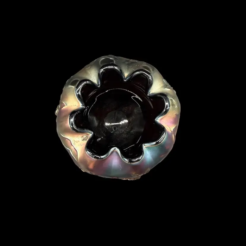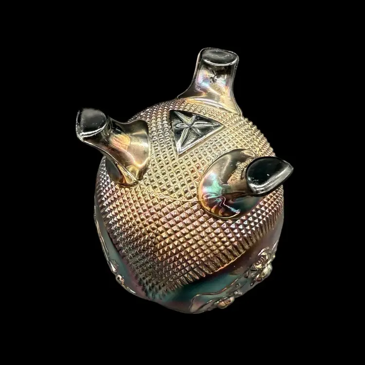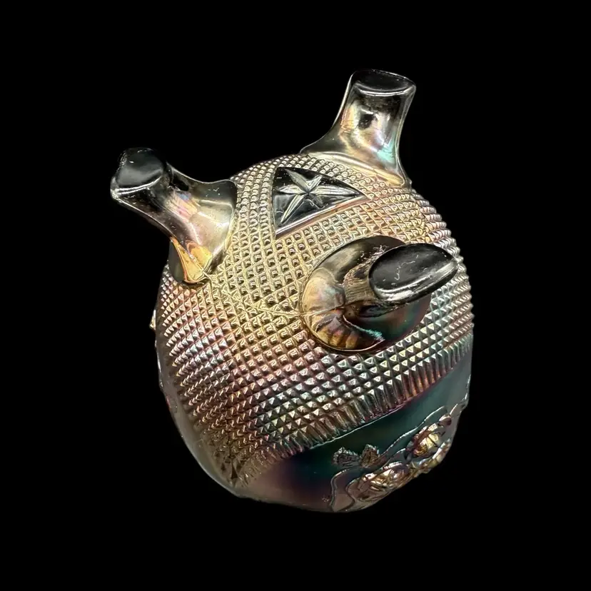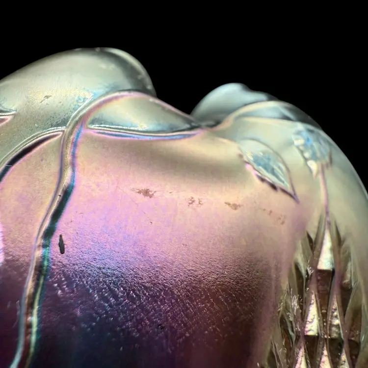 The Northwood Amethyst Fine Cut & Roses Variant Carnival Glass RoseBowl Antique is a stunning piece of art glass originating from the United States. Featuring a floral & diamond point pattern in a dark purple color, this vintage vase is crafted from carnival glass with a stunning iridescent finish. The Art Nouveau style of this decorative piece makes it a collectible item perfect for glass collectors, and the variant (no bottom circular ring) is less common and gives the piece a more polished overall look.