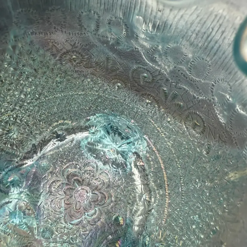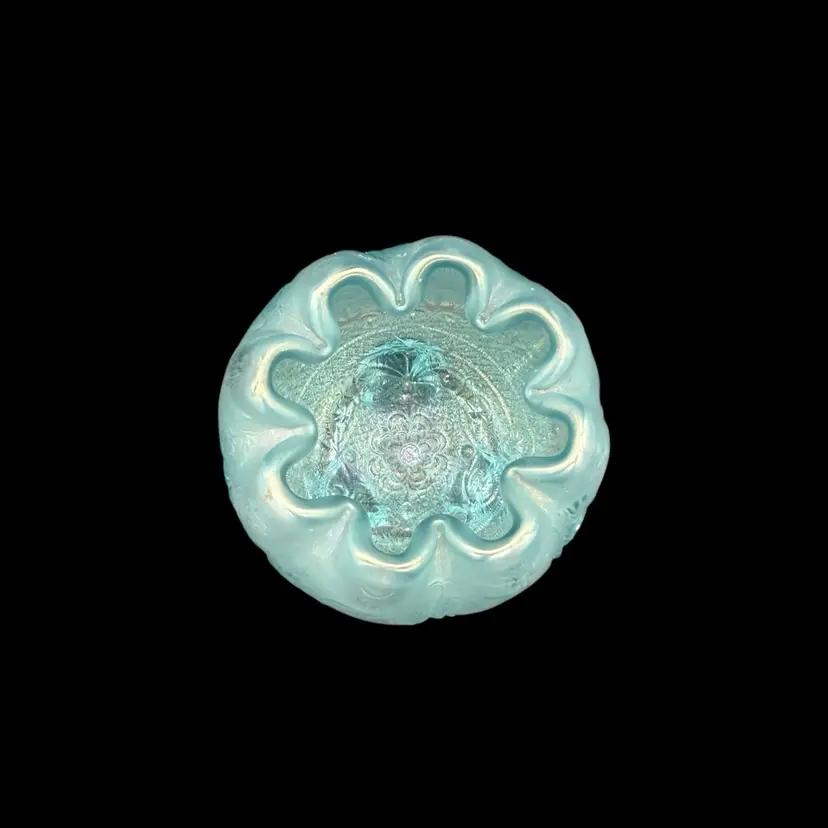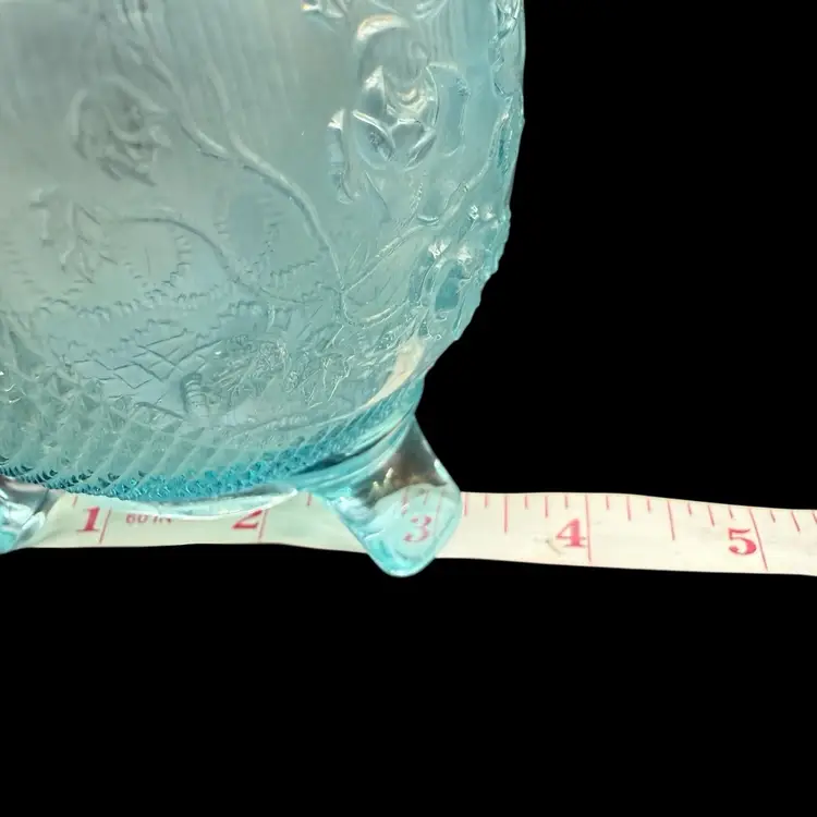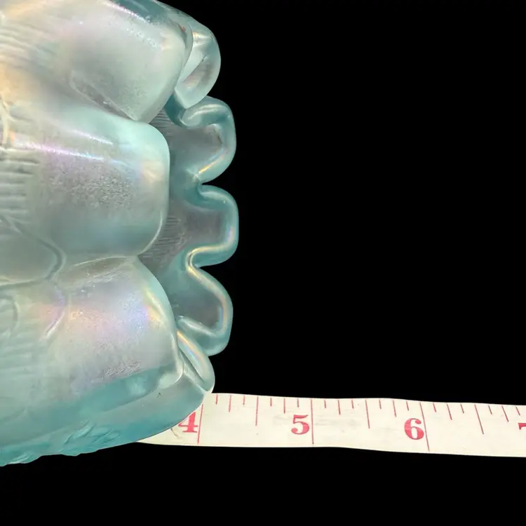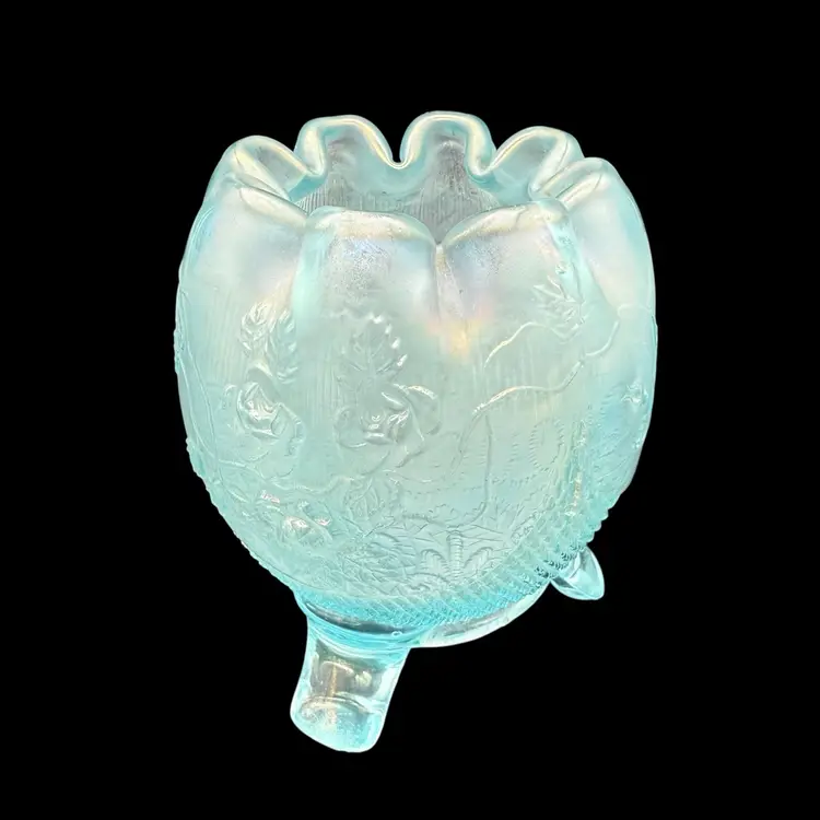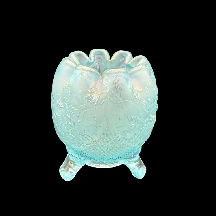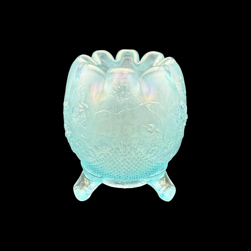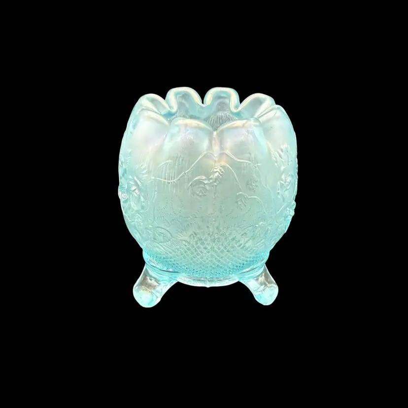 The Northwood Ice Blue Fine Cut & Roses Fancy Interior Carnival Glass RoseBowl is a stunning antique piece of art glass from the early 1900s. Originating from North American, specifically the United States, this vase features a beautiful floral pattern with iridescent hues. The Art Nouveau style and production technique of pressed glass add to its charm, making it a desirable decorative piece for collectors of vintage glassware. With its intricate design and 3D effect, this rosebowl is sure to add a touch of nature and artistry to any collection.