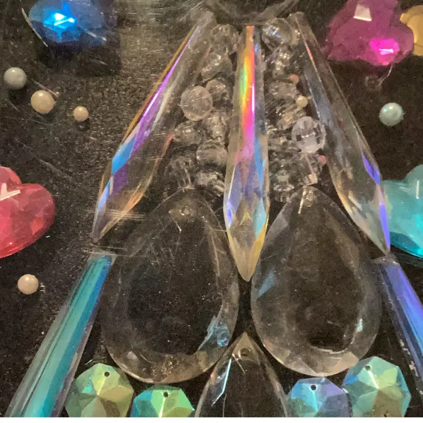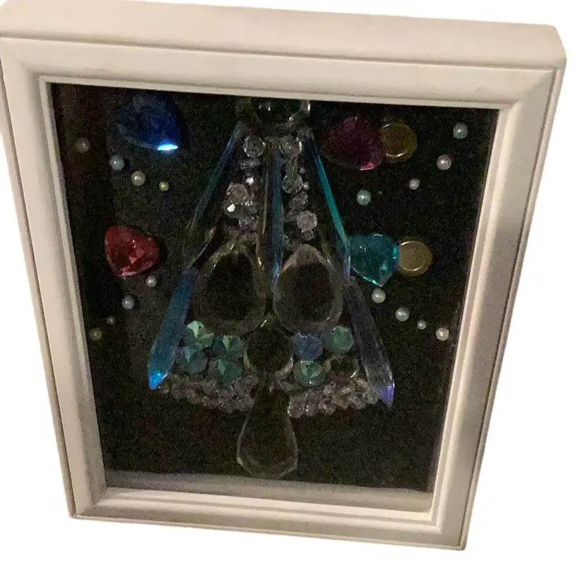 I need this shadowbox a long time ago it’s made with a glass crystals and some some kind of beads. I don’t know what I used on it but it’s all encased in a shadowbox type frame. I’m not really sure what all the stuff is that I use, but I made it long time ago so it is vintage. I’ve made this about 20 years ago. I’ve had it for a long time and it needs a new home. If shipping is over, I will reimburse.