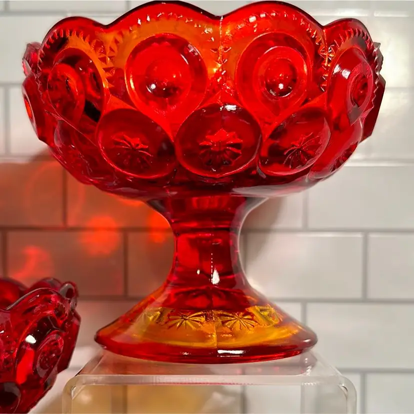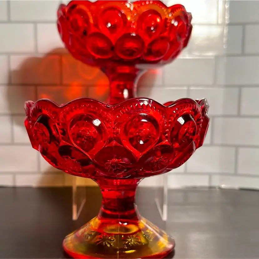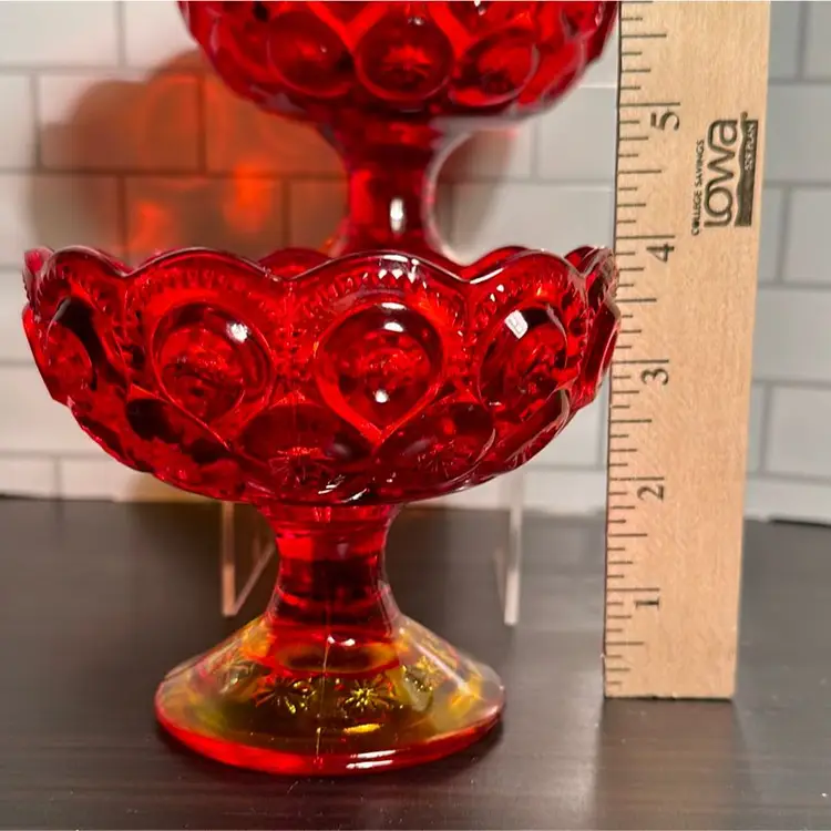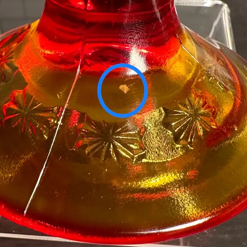 These candlestick holders measure 4” tall and 4.5” in diameter. One does have a foreign material inclusion in the base (last picture). No chips or cracks. Cadmium glow doesn’t photograph well, in my opinion, but these will glow.