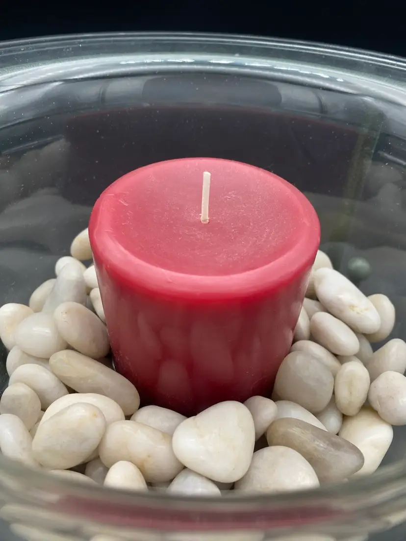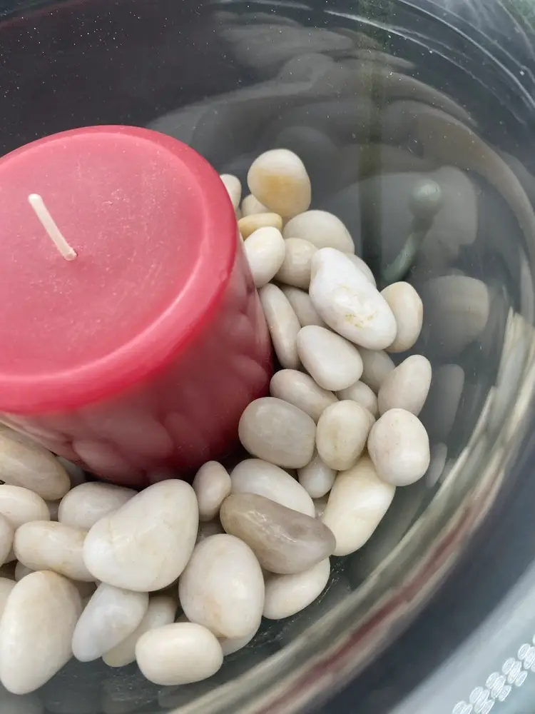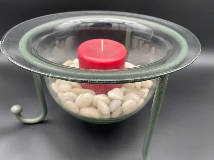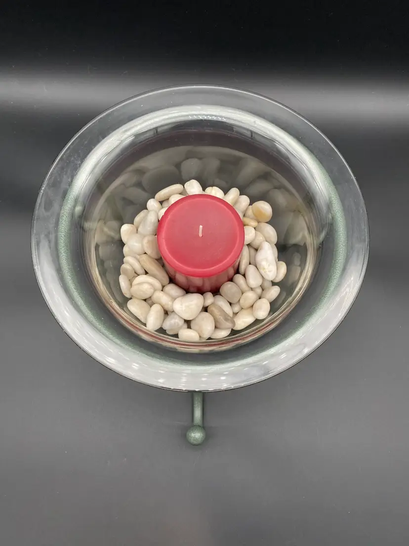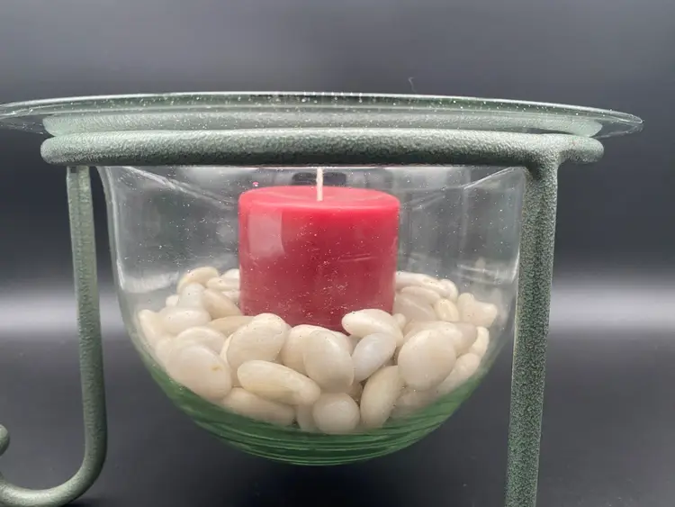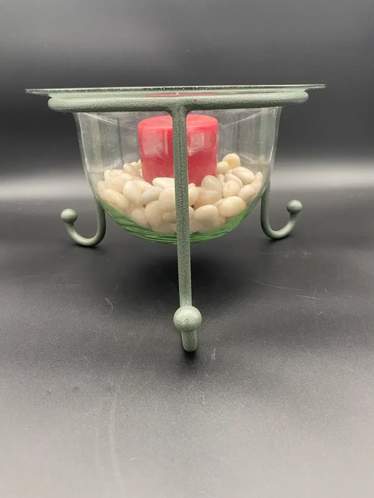 You are purchasing one Seville Table Top Candle Holder Stand by PartyLite. This Piece includes a Wrought Iron Stand, Clear Glass Bell Shaped Bowl, Red Candle and filled with Polished Stones. In total, this Piece is up to 11.75 inches wide at the Base of the Stand, and 7 inches tall. This Piece is in excellent condition. Does not include original packaging, but was never used as a Votive and only as a Decor Piece.