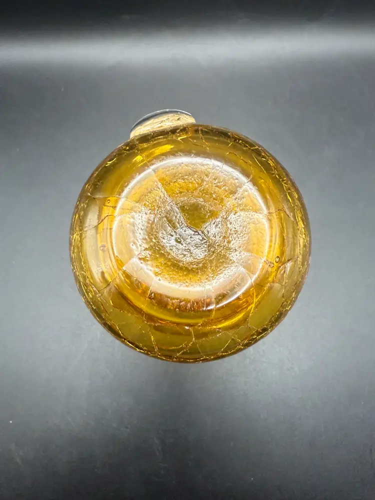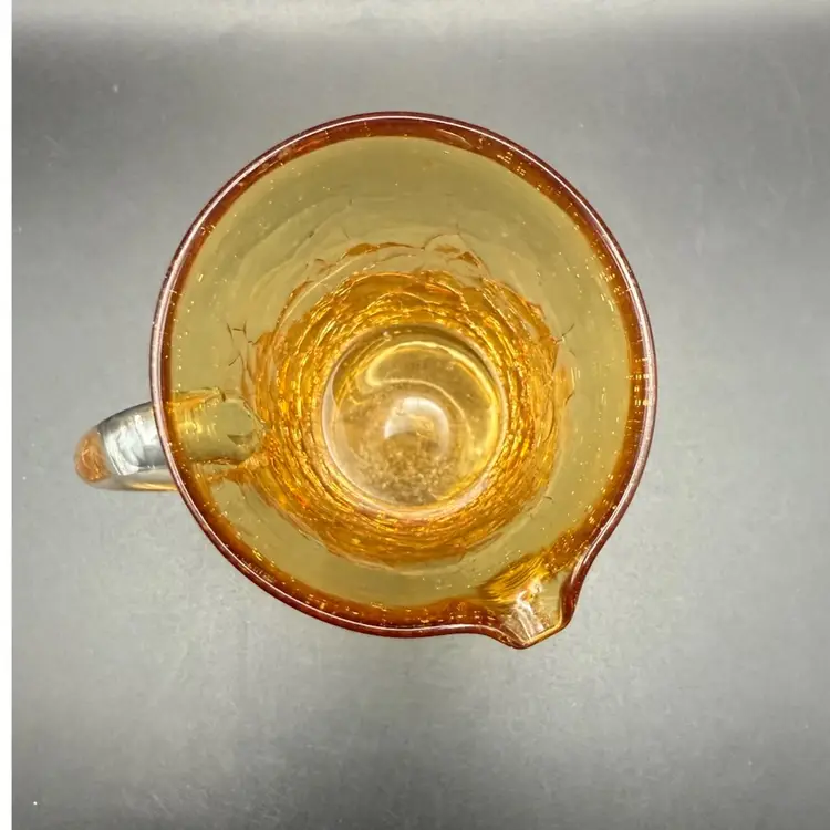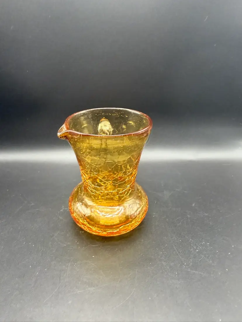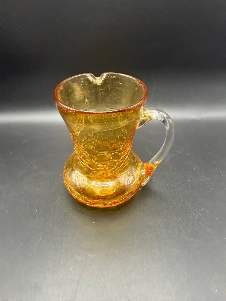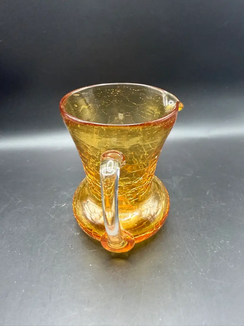Crackle glass, also known as ice glass or Grizac glass, is a decorative glass technique where molten glass is plunged into cold water, causing it to fracture. The glass is then reheated and encased in a clear layer to seal the cracks, creating a unique, spiderweb-like pattern. This particular pitcher, with its amber hue and crackled finish, is characteristic of decorative glassware produced in the mid-20th century.