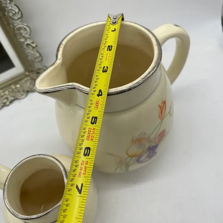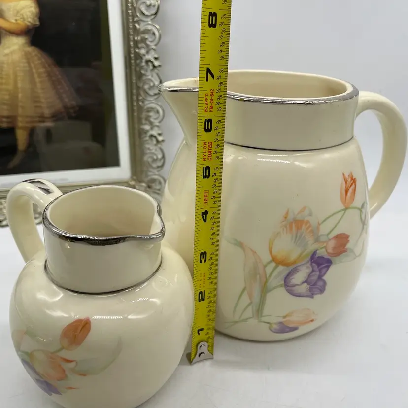 This is a very thick ceramic pitcher with creamer set. Lovely tulip transfer. Restaurant ware thickness.