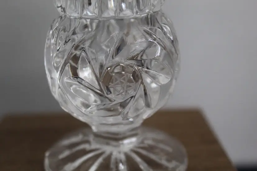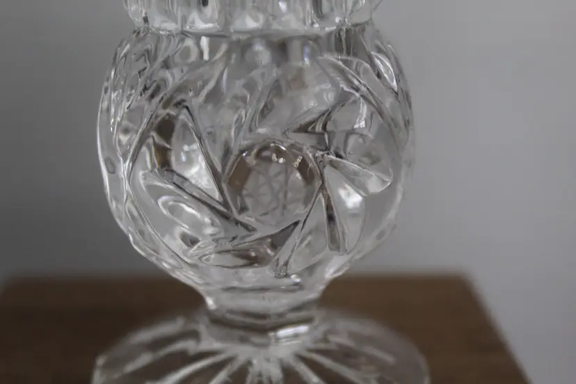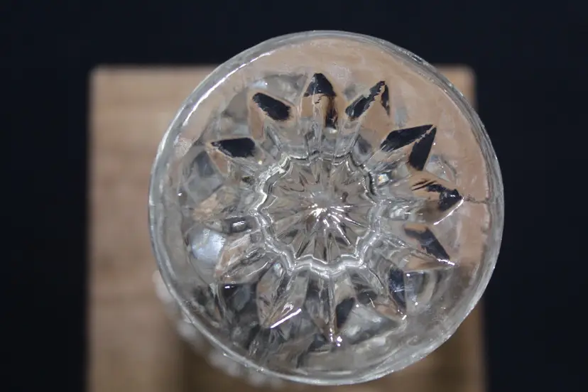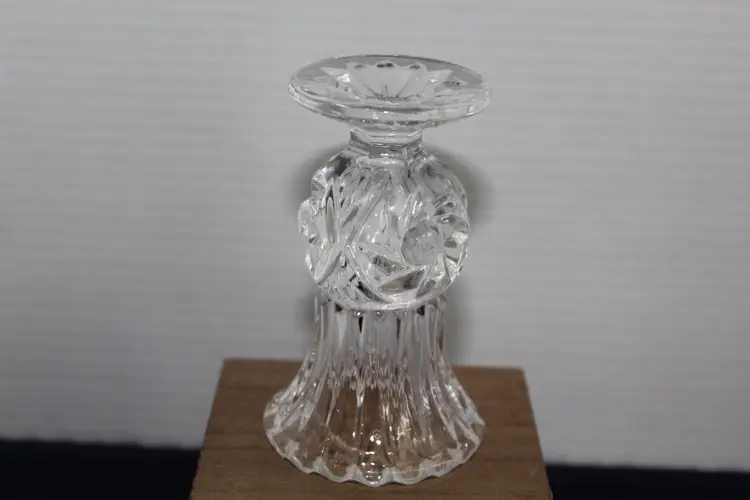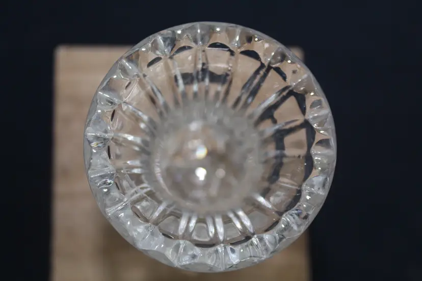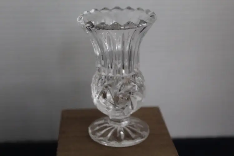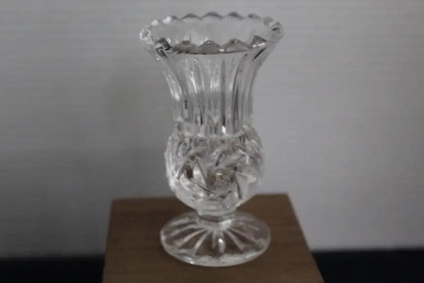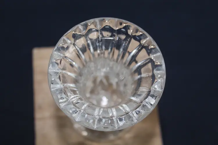 This pressed glass posy vase features a whirling hobstar base and a flared ribbed top with a sawtooth rim, measuring 4 inches in length. The clear glass vase is etched with a ribbed pattern and is a product of fused glassmaking technique. Perfect for showcasing a small bouquet of flowers, this decorative collectible adds elegance to any space with its intricate design and craftsmanship.