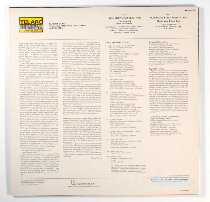 The Firebird/Overtures And Polovetsian Dances, by Robert Shaw, features a vibrant performance of Igor Stravinsky’s The Firebird suite, derived from the 1910 ballet, alongside selections from Alexander Borodin’s opera Prince Igor, performed by the Atlanta Symphony Orchestra and Chorus. Shaw’s interpretation, released in 1980 by Telarc, is celebrated for its dynamic range and clarity, showcasing his mastery in choral and orchestral direction. Historically, The Firebird marked Stravinsky’s breakthrough as a composer, establishing him as a leading figure in 20th-century music, while Borodin’s Polovetsian Dances are noted for their exotic orchestration and influence on later musical theater. The album itself did not produce hit singles, as it is a classical recording focused on orchestral and choral works rather than commercial singles. This release remains significant for its high-fidelity recording quality, a hallmark of Telarc’s early digital recordings.