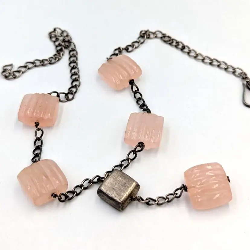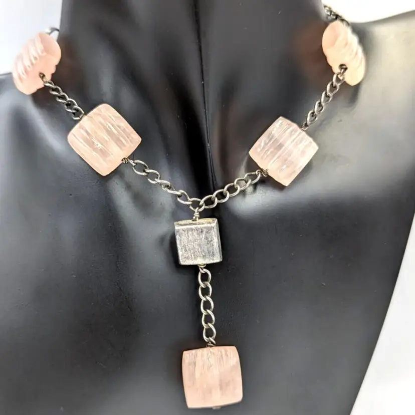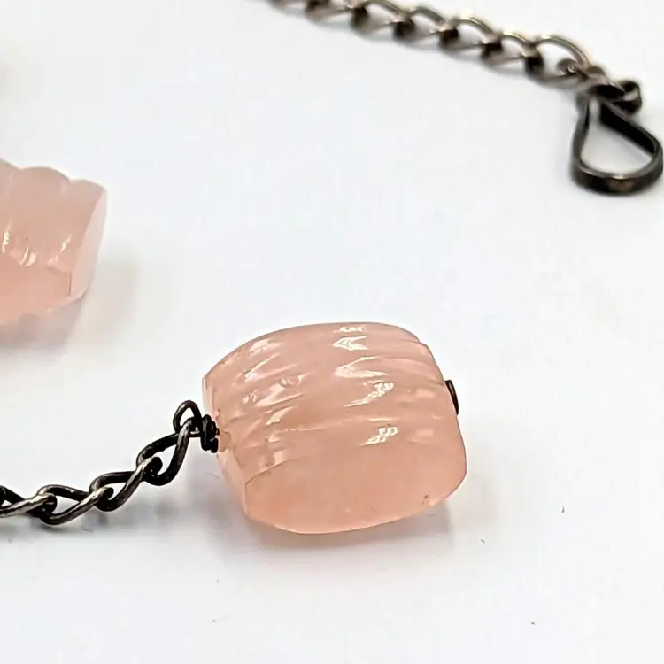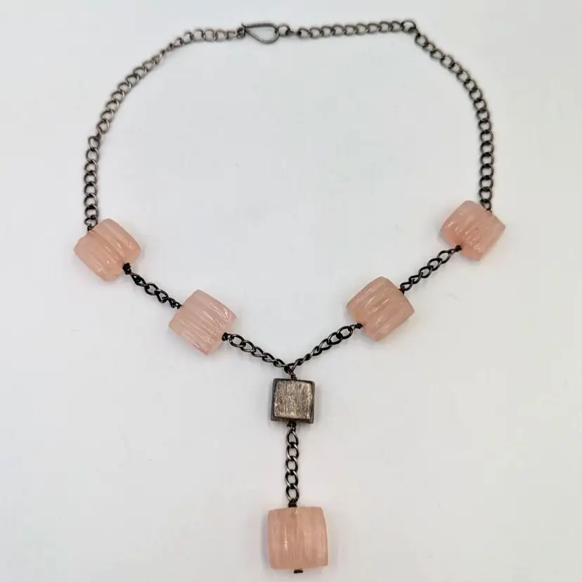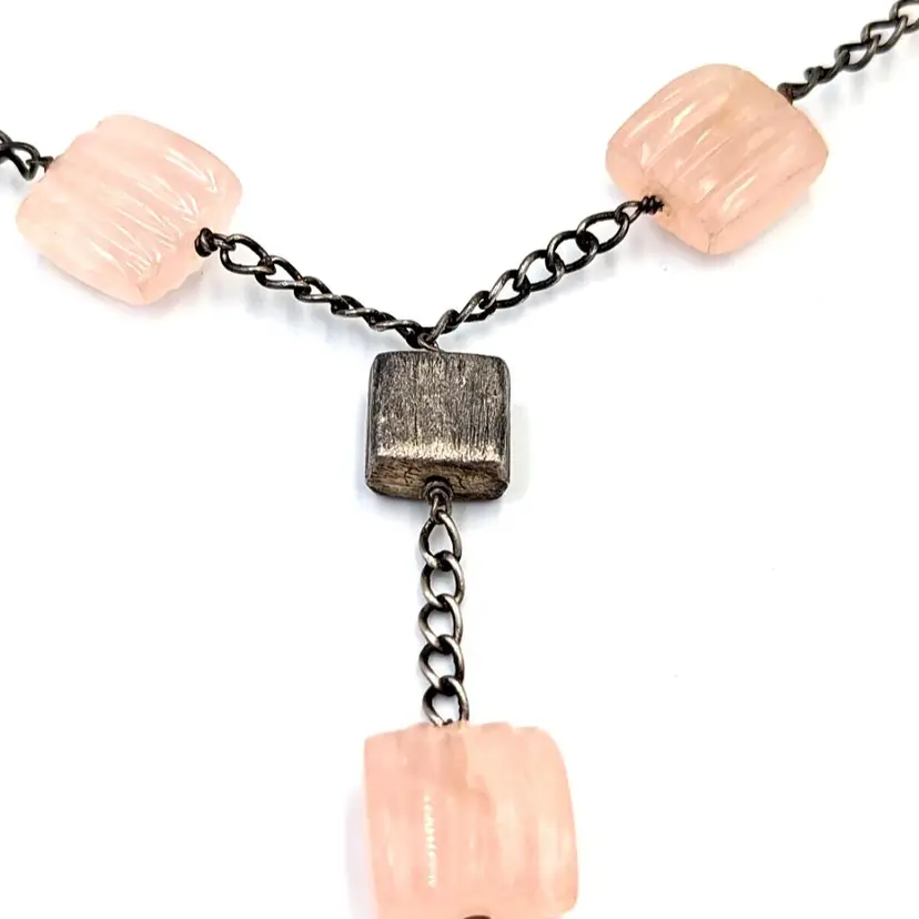Rose Quartz Sterling Silver Necklace Y-shape Modernist Art Deco Carved Gemstones Necklace 16" long, 2" drop dangling part 30 grams total weight Marked 925 Good vintage condition