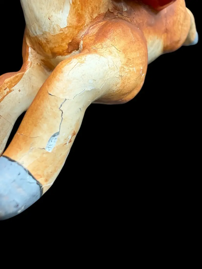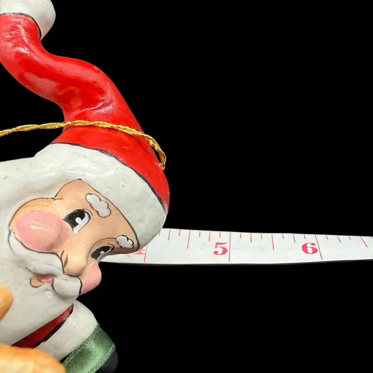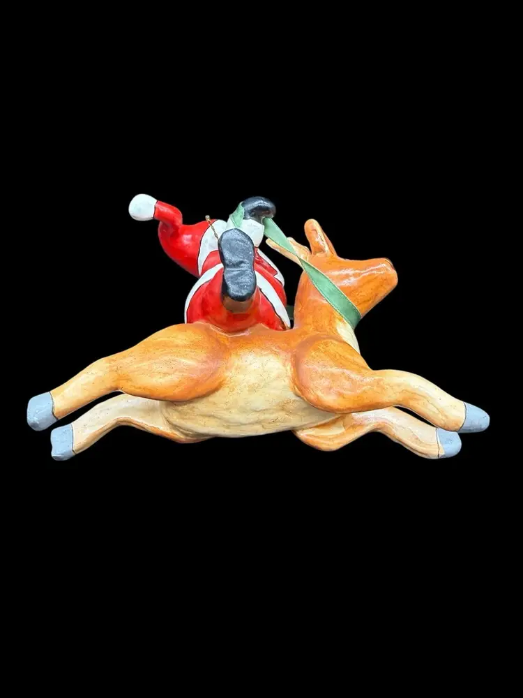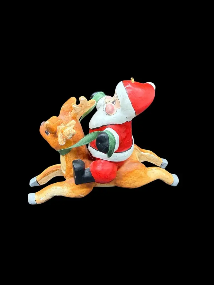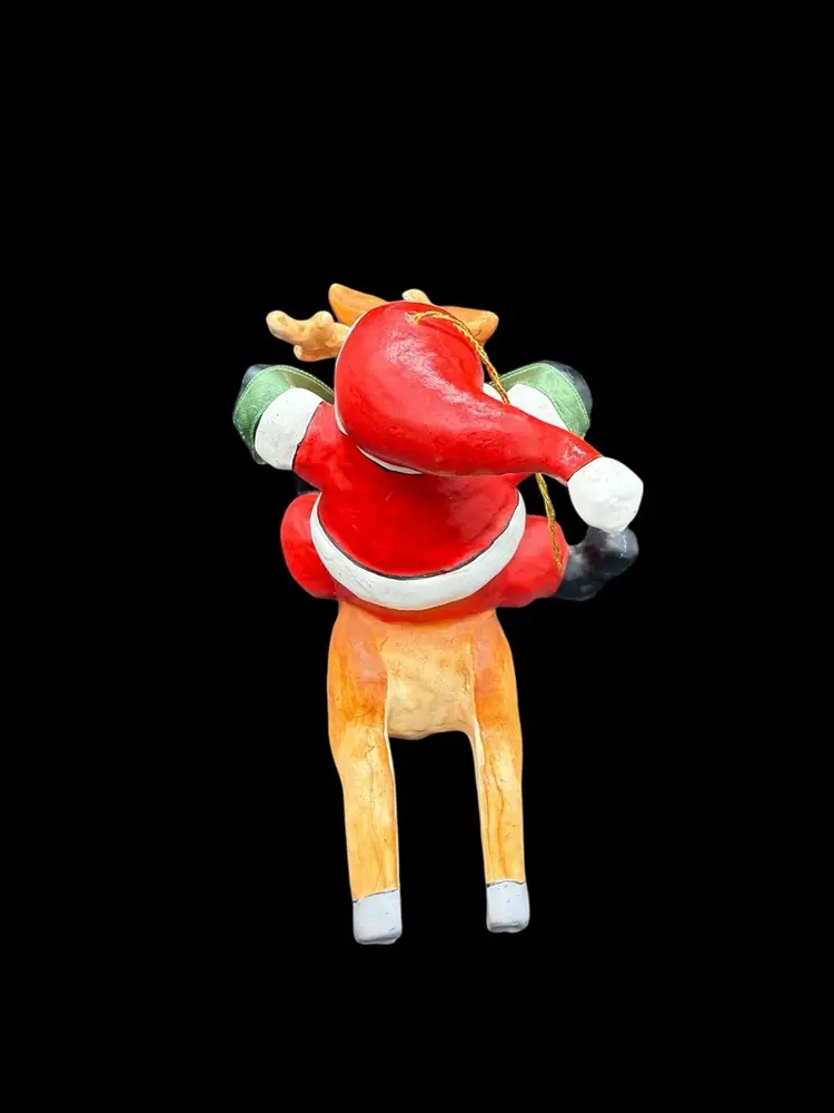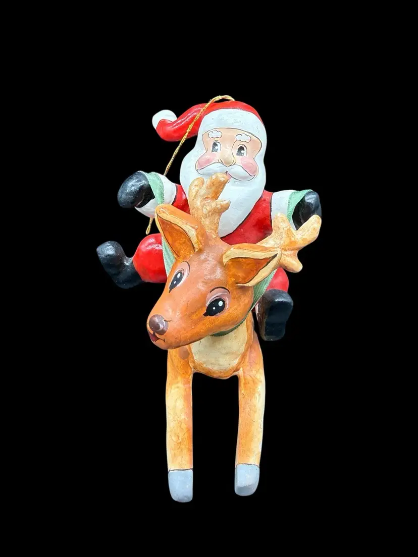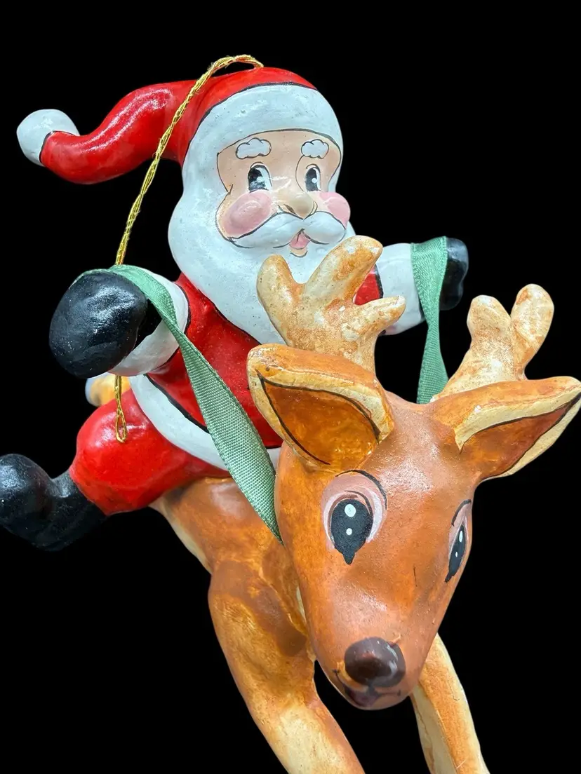 This vintage Santa riding a reindeer Christmas ornament is a charming piece of folk art made from paper mache. The multicolor hand-painted design adds a whimsical touch to any holiday decor. The oversized ornament features Santa Claus in a playful pose, perfect for collectors or those looking to add a unique touch to their Christmas tree. This vintage ornament is a one-of-a-kind piece that captures the magic and nostalgia of the holiday season.