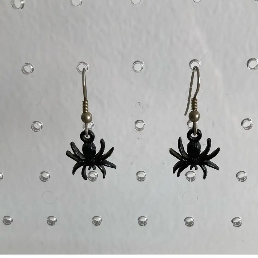 Scarey black Halloween spider earrings. Made from enameledmetal. They measure 5/8” and drop 1 1/4”.