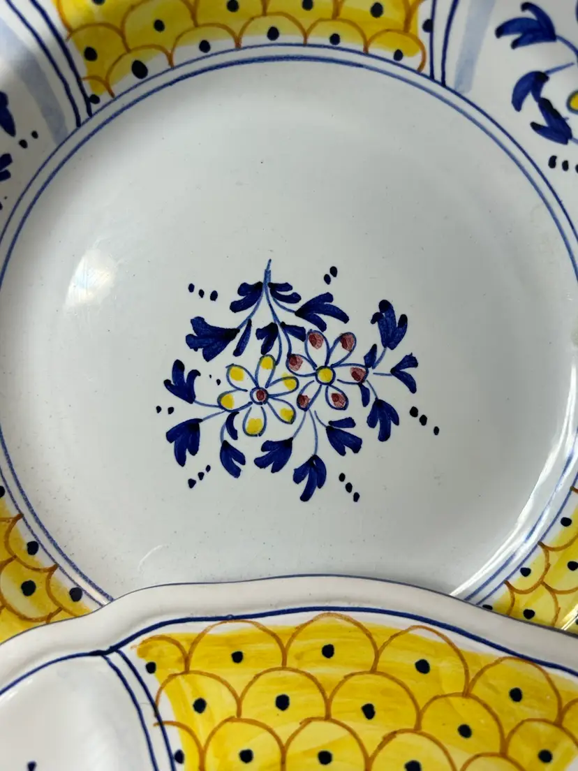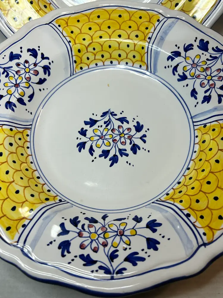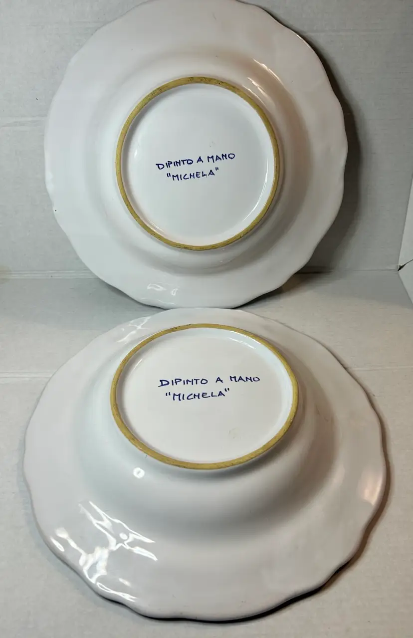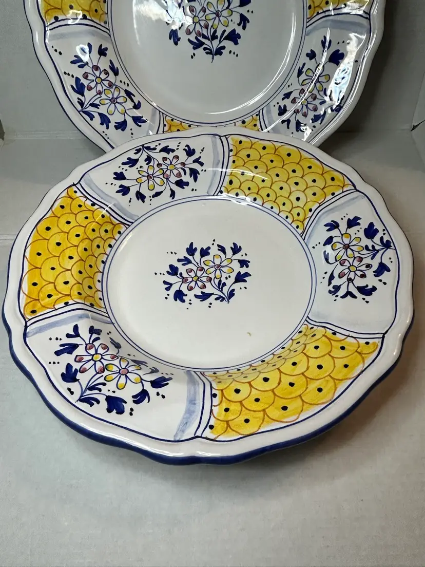 This is a set of two Deruta/Dipinto a Mano plates from Italy, featuring a unique design in yellow and blue. The handmade craftsmanship and vibrant colors make these plates a charming addition to any dining table or collection. The intricate details and high-quality materials showcase the artistry of Italian pottery, adding a touch of elegance .
