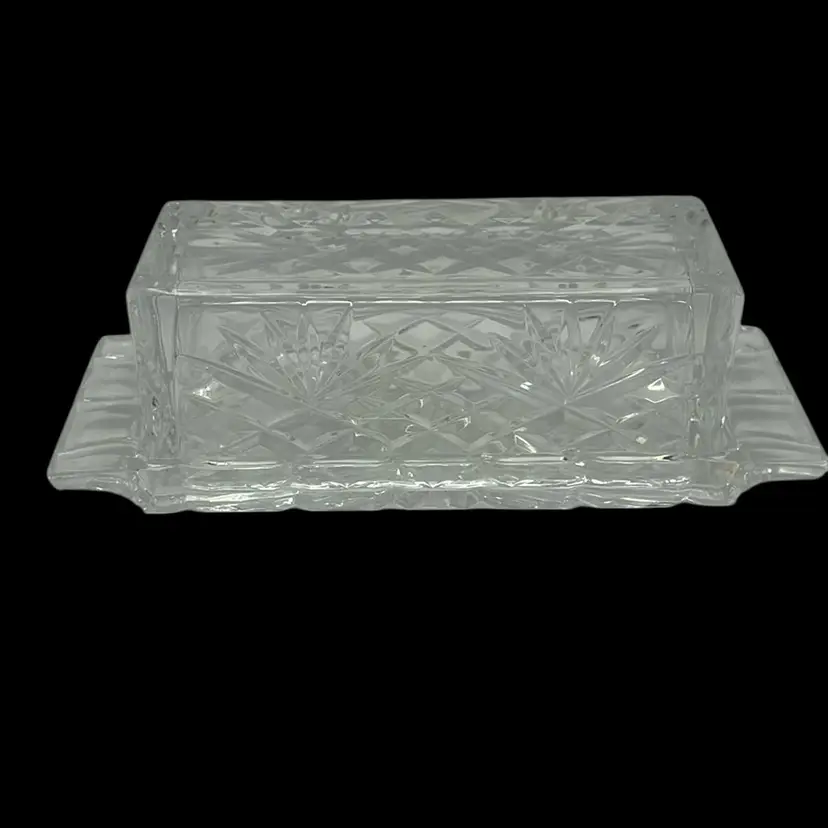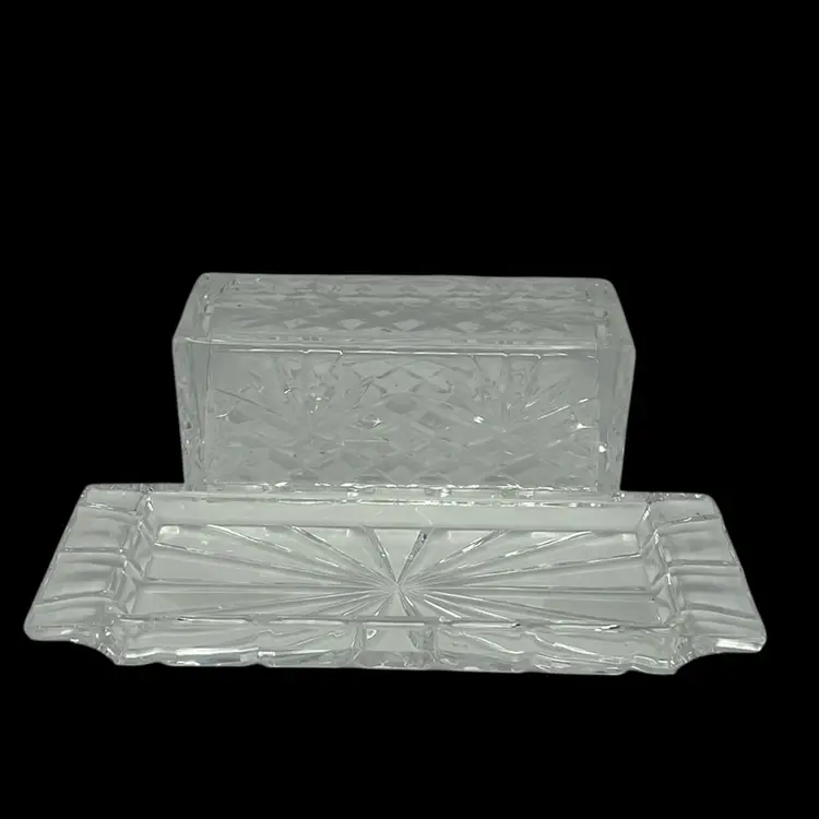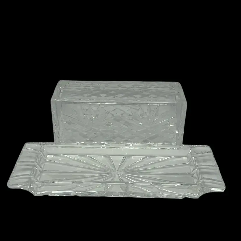 Featuring a stunning detailed cut glass design. Two pieces with a rectangular tray and a covered lid. Mint condition!