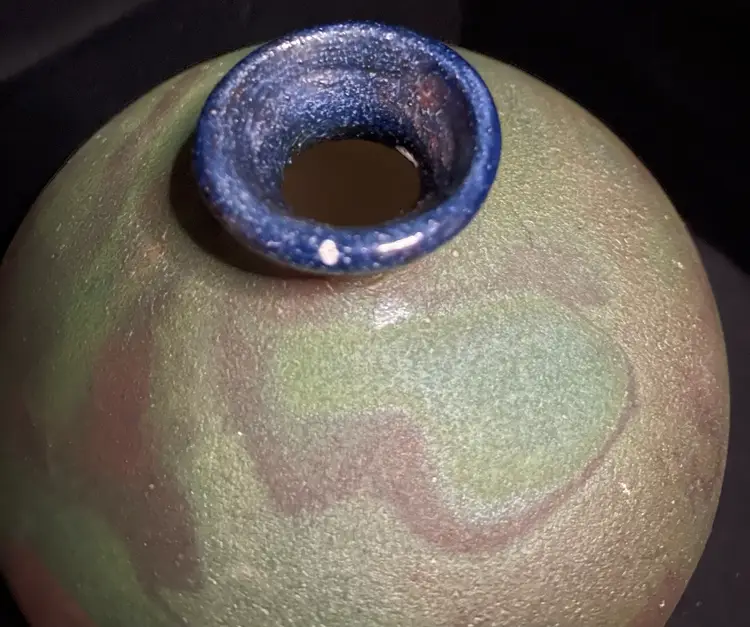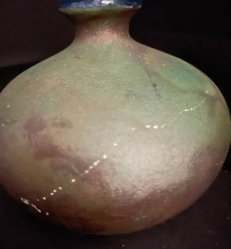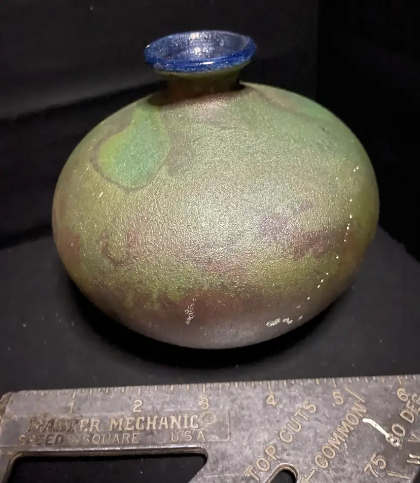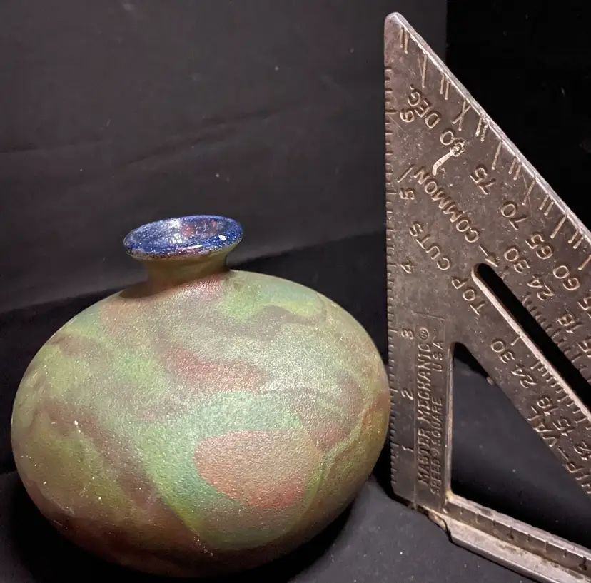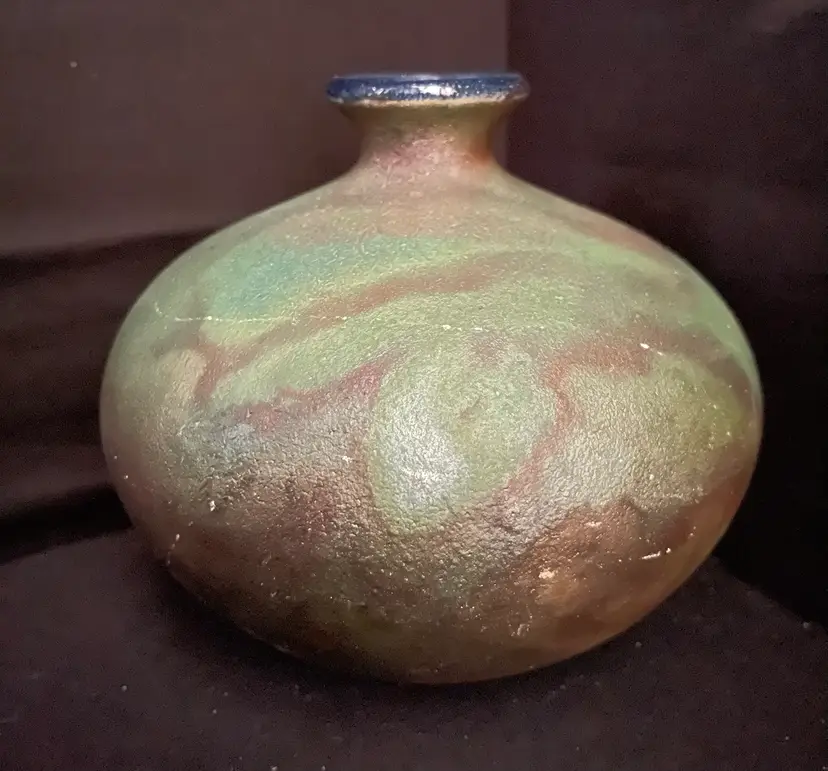 This beautiful vase by artisan Stephan Roy is a unique piece of art pottery that is signed by the artist. The multicolor clay vase features a stunning Raku glaze finish and has been handcrafted with the production technique of Raku Pottery. The vase is an original piece, created in the studio of Stephan Roy in the United States. It would make a great addition to any home decor collection and is perfect for displaying flowers or as a standalone decorative piece.
