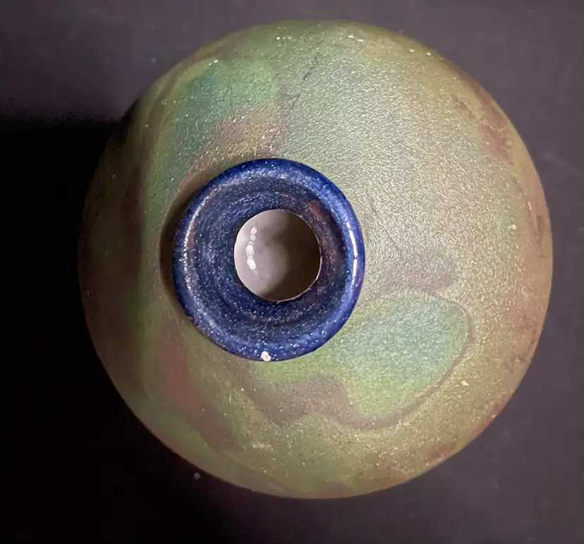 This item has a small chip at the top of the vase as indicated in the picture. Additionally, there are white markings on the exterior of some of the vase- shown in pictures.