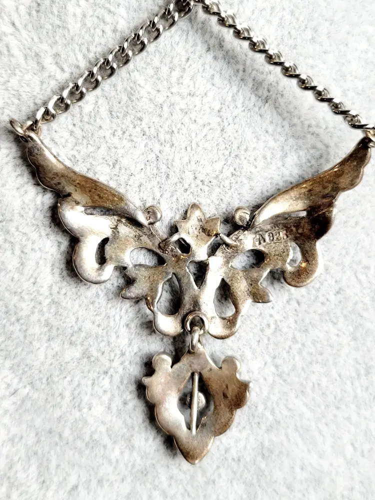 This antique marcasite necklace from the 1930s embodies the elegance of Art Deco design. The intricate detailing of the sterling silver pendant adds a touch of vintage sophistication. A true statement piece, it reflects the timeless allure of an era defined by its bold artistic expressions.
