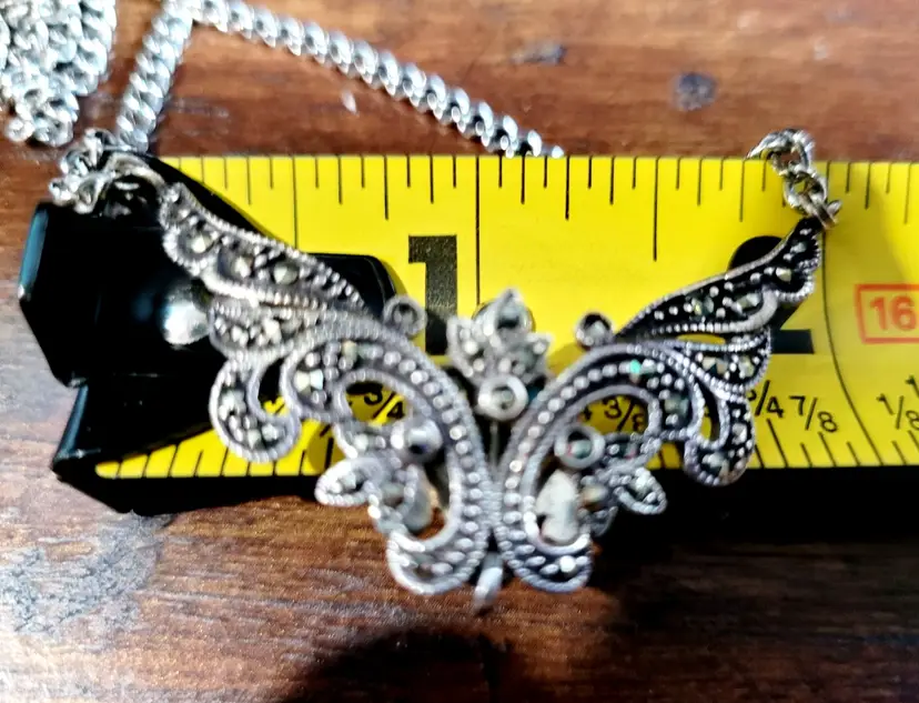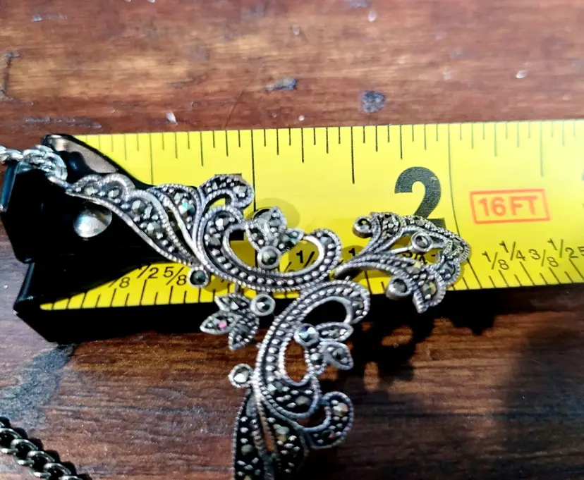 • Intricate marcasite detailing • Sterling silver construction • Articulated pendant design • 24 inches in length