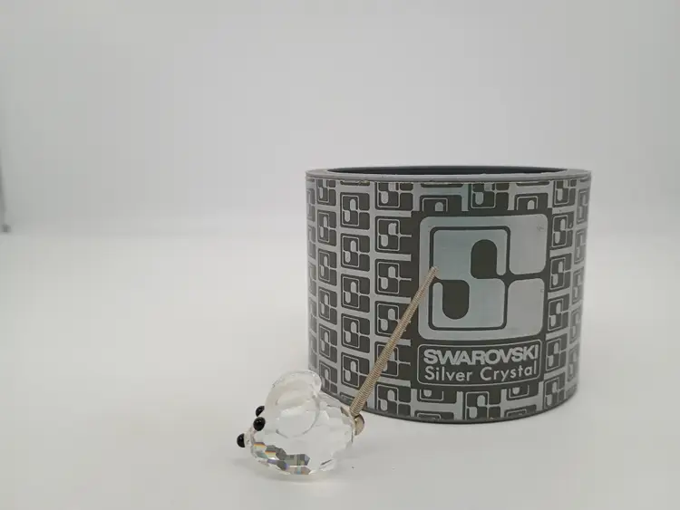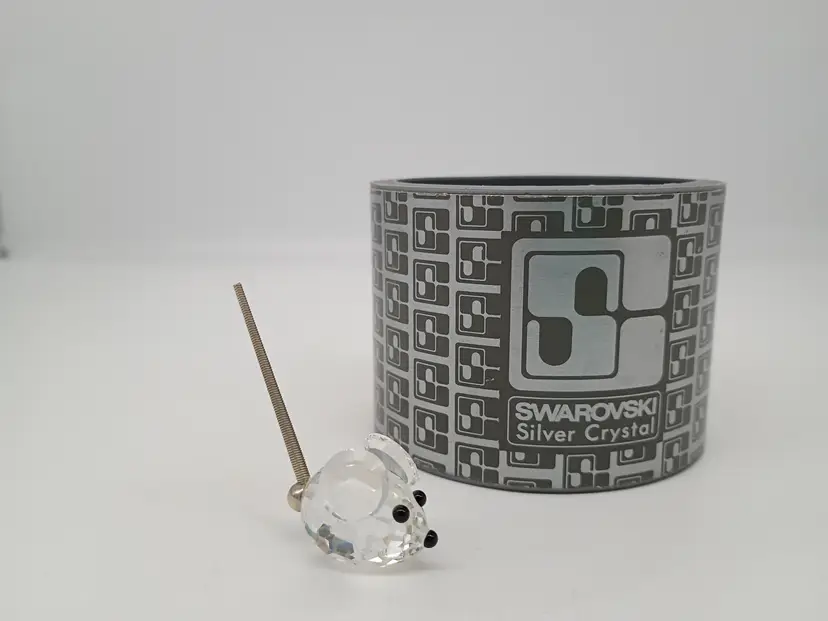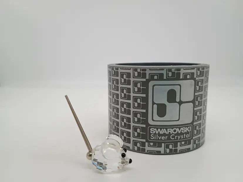 Swarovski Crystal Mouse w/ Spring Tail Art 7655 NR 023 Retired. This is 2 inches tall to tip of spring tail and 1 inch in diameter. Comes with paperwork and original box. No Chips or cracks no flea bites. Excellent condition. This does have the Swarovski mark on bottom its just so tiny that glare of the facets hides it. Ships USPS domestically and UPS/ USPS International Shipping Globally
