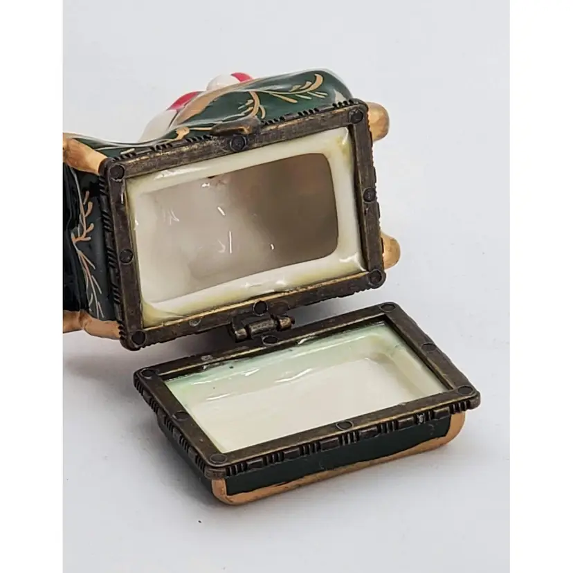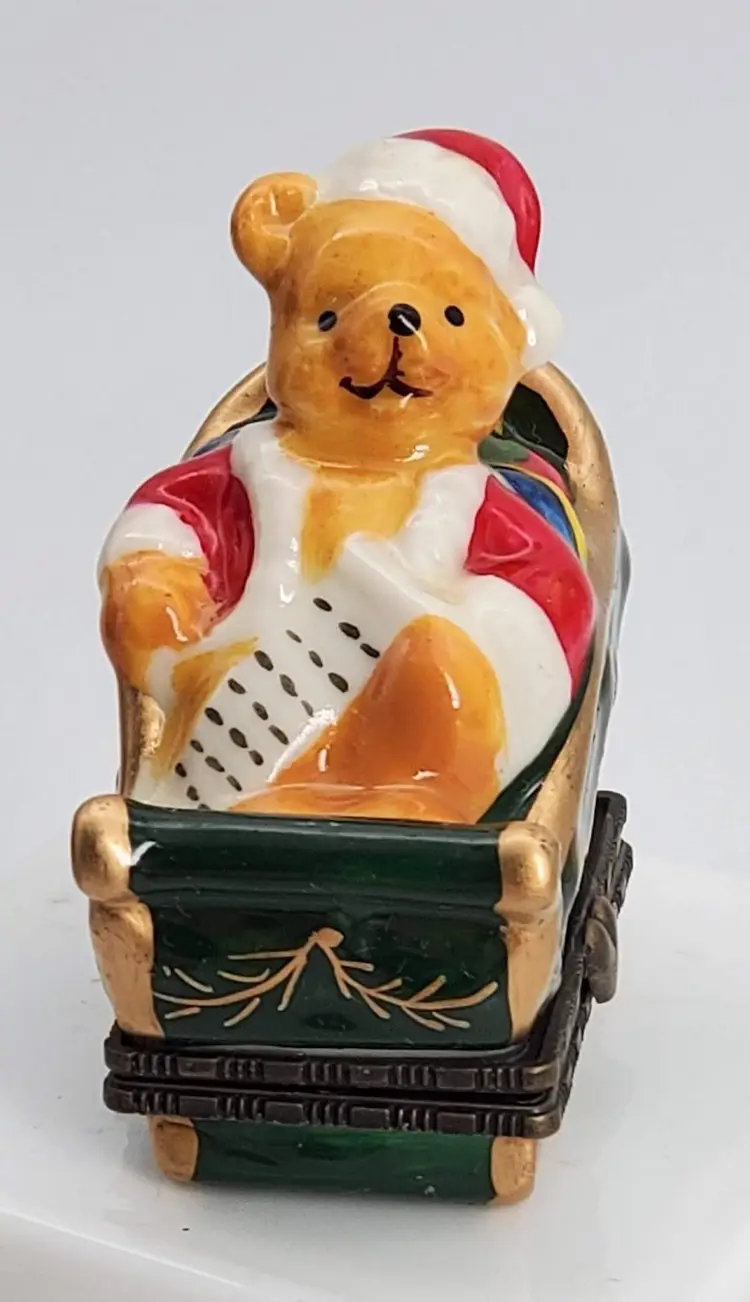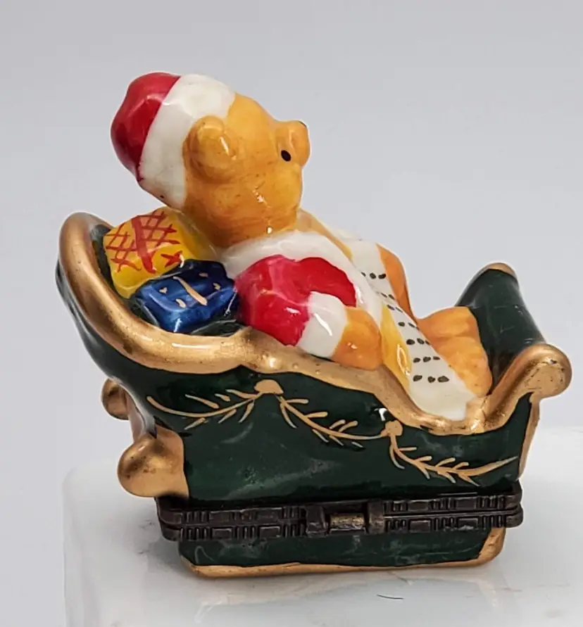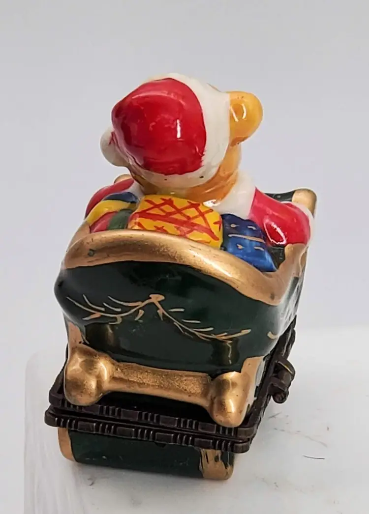 Vintage trinket box with a Santa teddy bear in his Christmas sleigh surrounded by presents. Looks a little like Pooh, but it is not a Disney piece.
