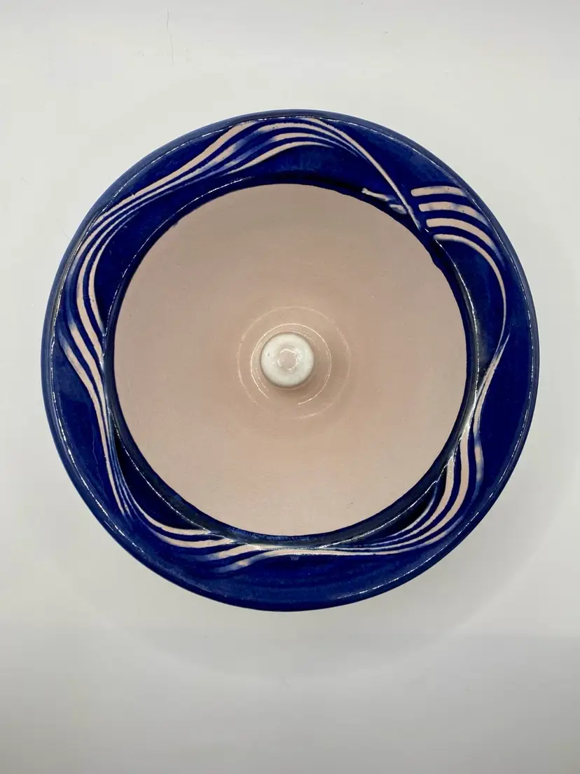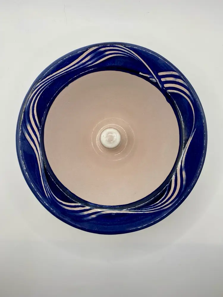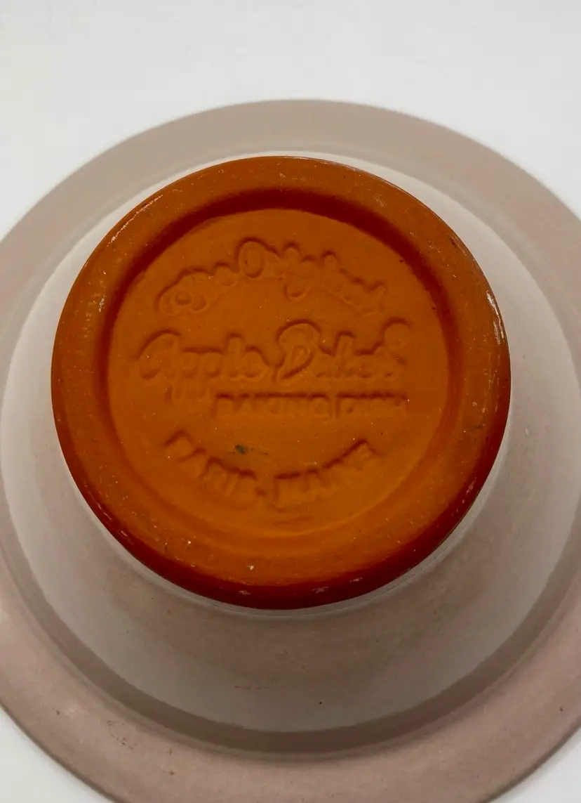 This lovely ceramic apple baker is a light lavender and navy color with a decorative swirl on the rim. The dish is 2.25 inches high and 6.5 inches wide, making it the perfect size for your baking needs. The dish is made by The Original Apple Baker and was crafted in Paris, Maine. It comes with a surface coating that will help keep your baked goods from sticking to the dish.