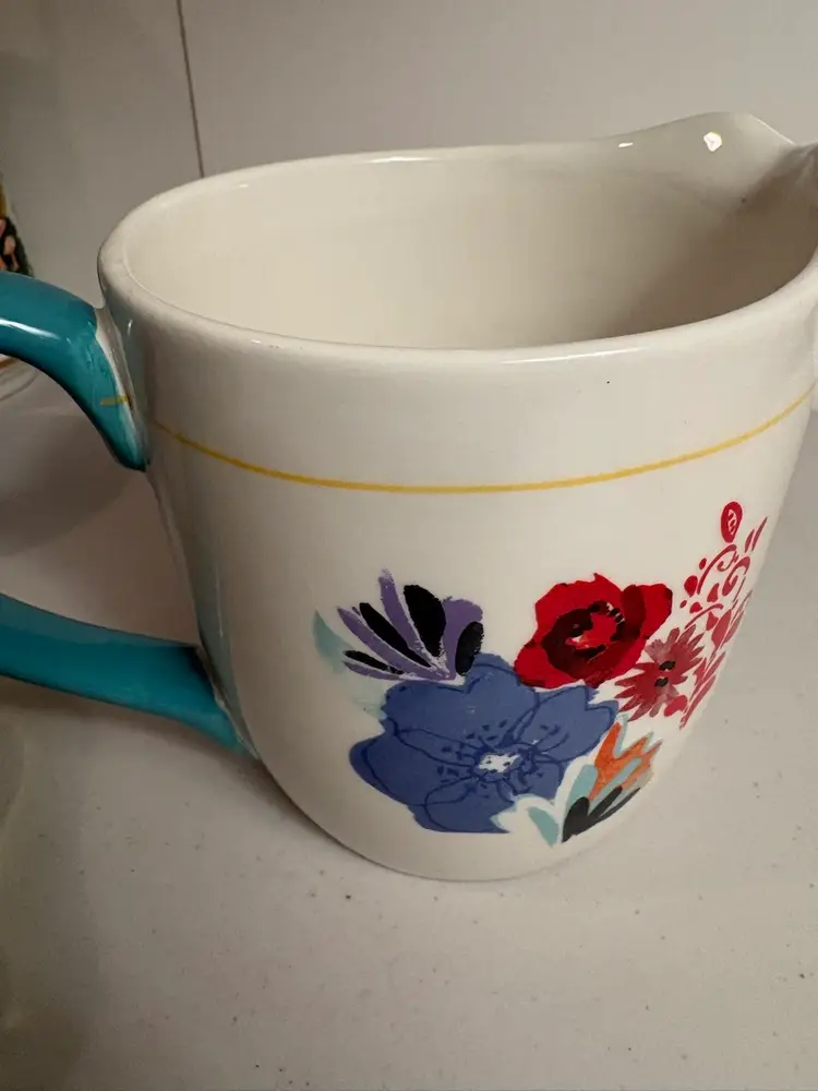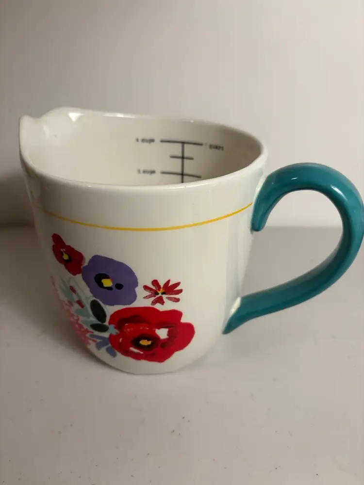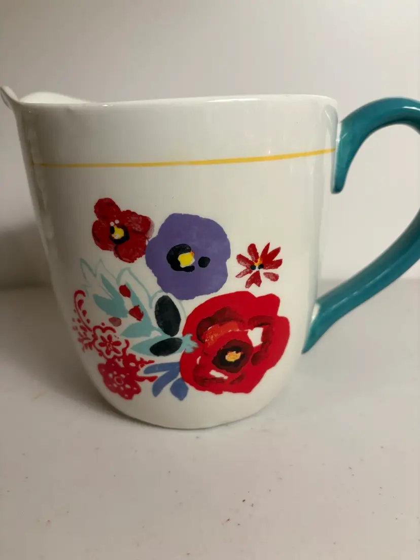 The Pioneer Woman Floral I Quart 4 Cup Measuring Pitcher is a charming addition to any farmhouse or country kitchen. Made of durable stoneware or ceramic, this round pitcher features a beautiful floral pattern in a multicolor design. With a 4-cup capacity and measurement markings, it is perfect for all occasions and easy to clean. Dishwasher safe for convenience, this measuring pitcher is a practical and stylish tool for any home cook looking to add a touch of rustic elegance to their kitchen.