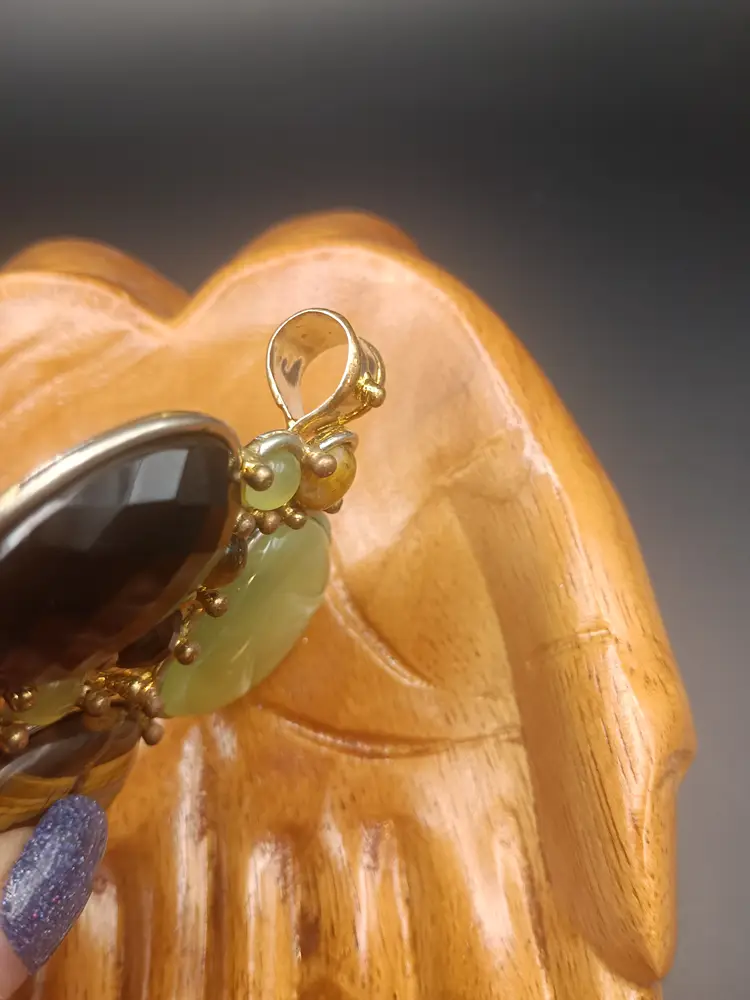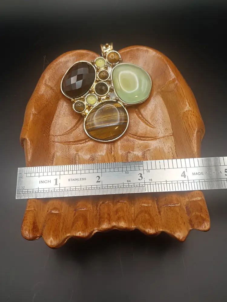 Hi thanks for looking!! You will receive this beautiful silver plated Tiger eye, Smokey Quartz and Agate pendant. The pendant is approximately 2 inches from top to bottom and side to side. It has a perfect bail ready for hanging on your favorite chain.