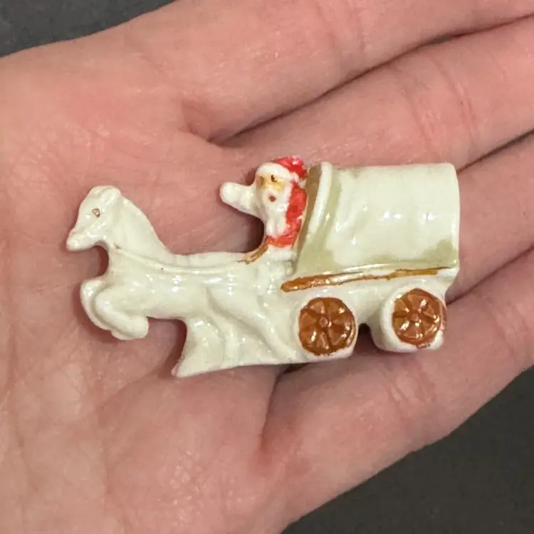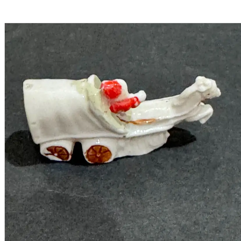Adorable tiny Santa in a covered wagon. Measures an inch and a half long. Minimal paint loss, considering age. An awesome little Christmas accent piece.