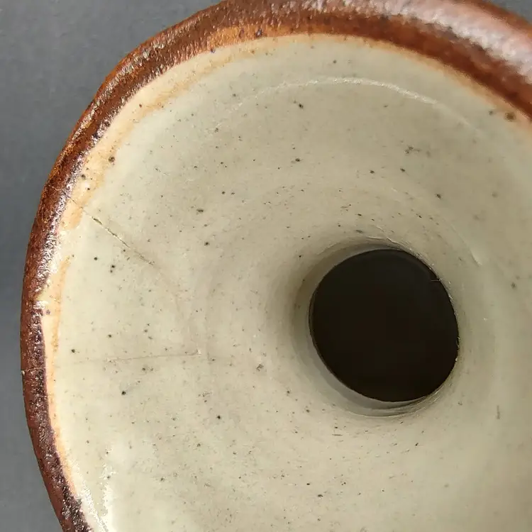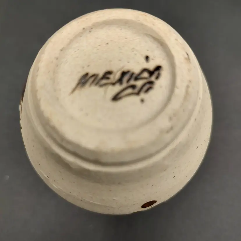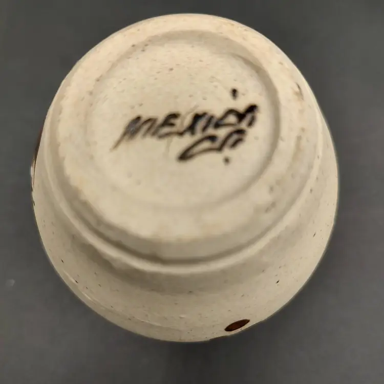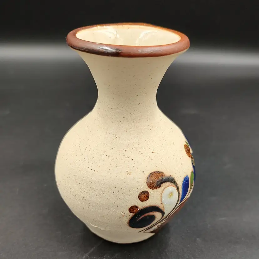 Tonala Mexican Pottery Small Bud Vase With Floral Motif. This item has been repaired. Height 4" x diameter 3". Made in Mexico