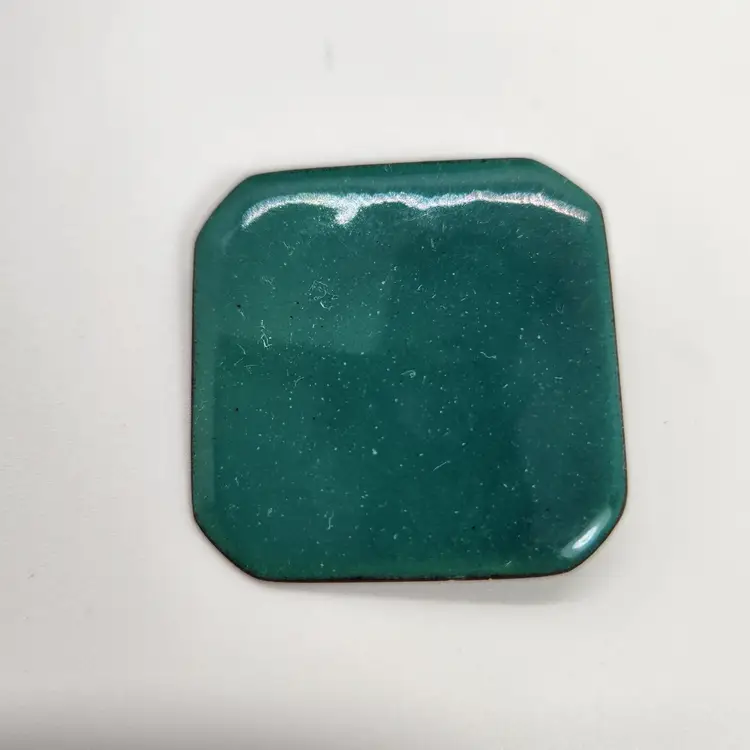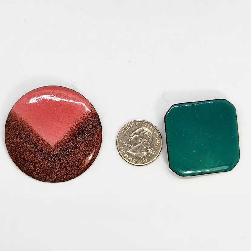 Make a statement with these dramatic modernist enamel on copper brooch / pin set. Free shipping on these items. Both these pieces have a completely smooth finish. One is salmon pink with darker accent glaze and the other is a medium aqua green (it looks darker in the first picture than it is but it will look different colors depending on what it is up against. Both could easily be adapted to hang as a pendant. Has a mounted C clasp closure which is sound. Great gift for the MCM or unique jewelry lover. Ships in a new jewelry gift box for gifting or storage.