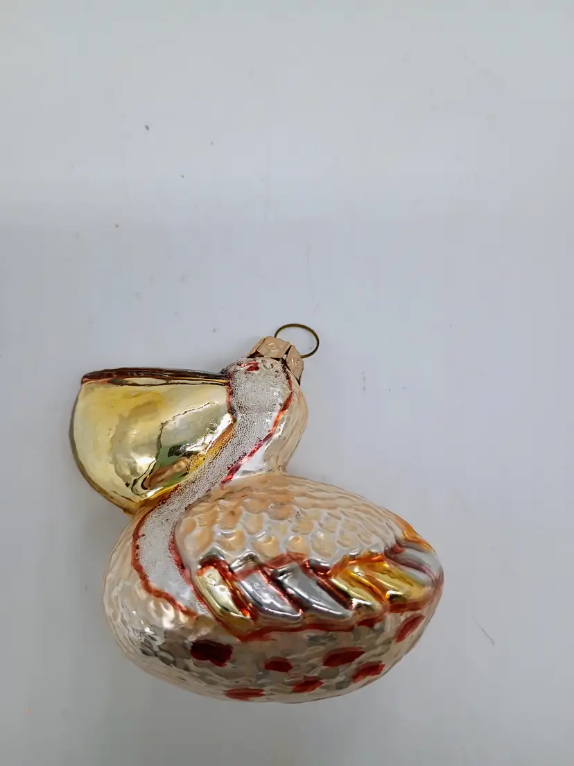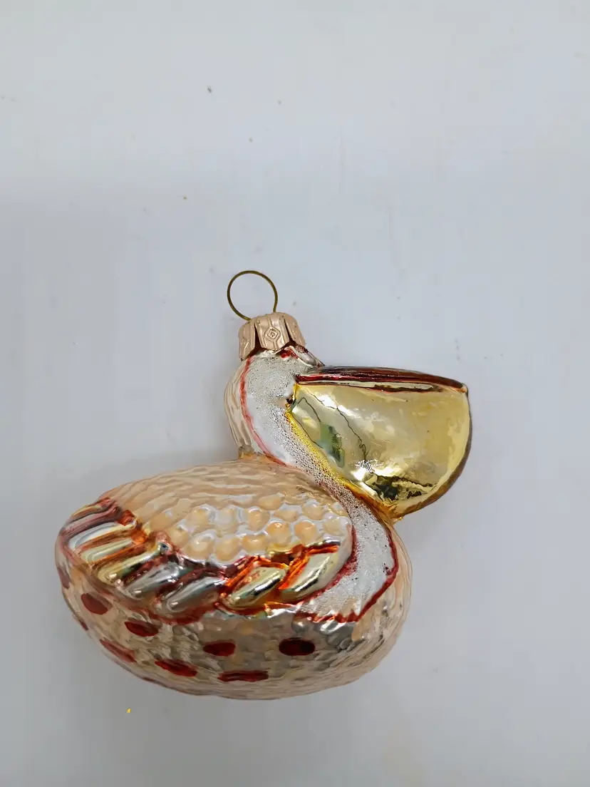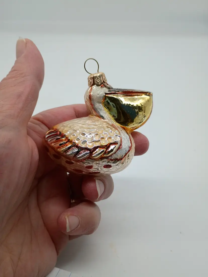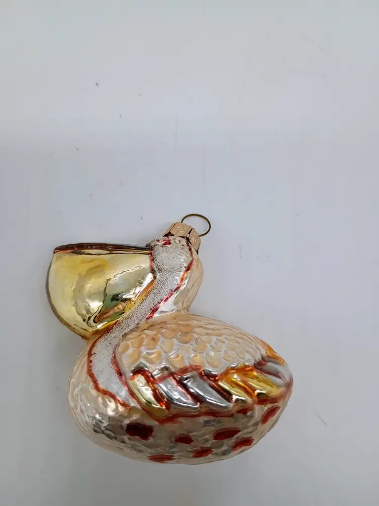 Varisovia of Poland Hand Blown Glass Pelican Christmas Ornament. This is about 3 inches tall 3.75 inches long and 1.25 inches wide. This is preowned, No chips cracks or flea bites, No paint / color loss. Heavy mirror like gilding on bill intact. Near Mint condition. Ships USPs domestically and UPS/ USPS International Shipping globally
