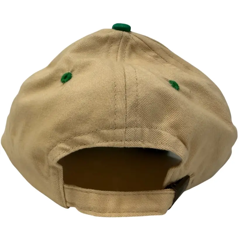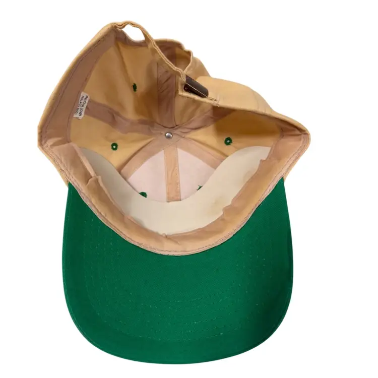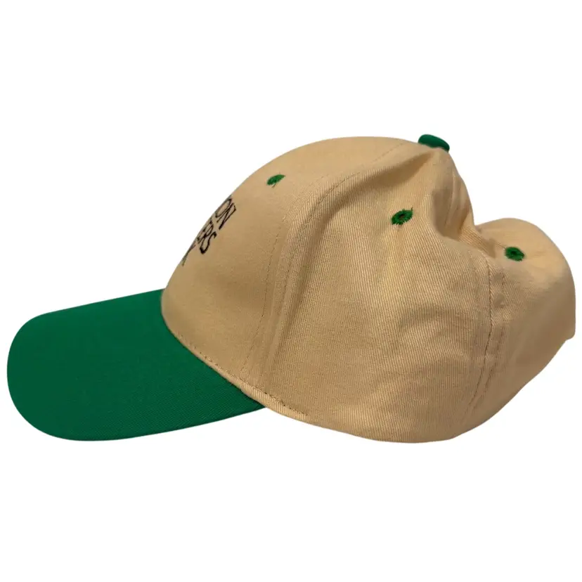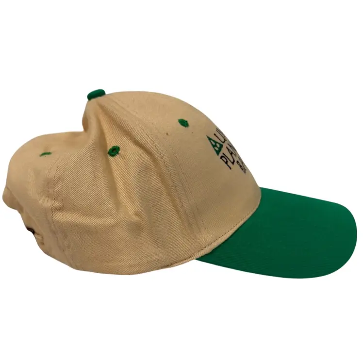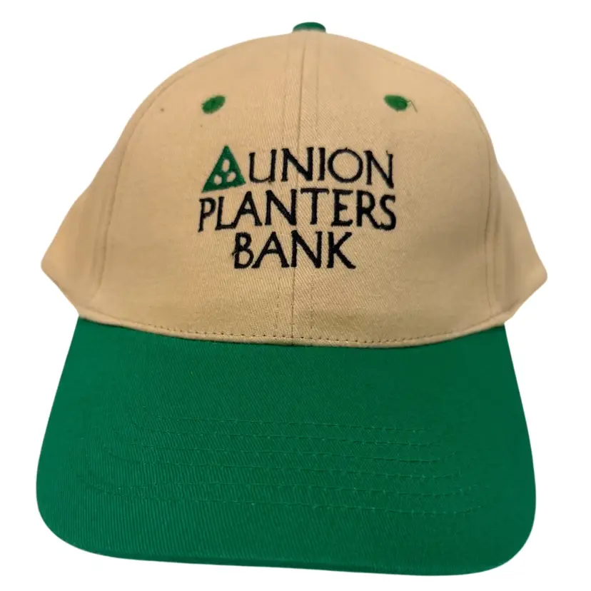 The Vintage 1990’s Union Planters Bank Two Tone Beige Green Adjustable Dad Hat is a unique and stylish accessory for men and women. Made from cotton with a canvas fabric type, this baseball cap features a solid beige/green color and adjustable sizing for a comfortable fit. Perfect for various occasions such as travel, parties, casual wear, or work, this hat is a nod to the 90s era with its vintage theme, Union Planters Bank branding, and dad hat style. Perfect for adding a touch of nostalgia to your outfit.