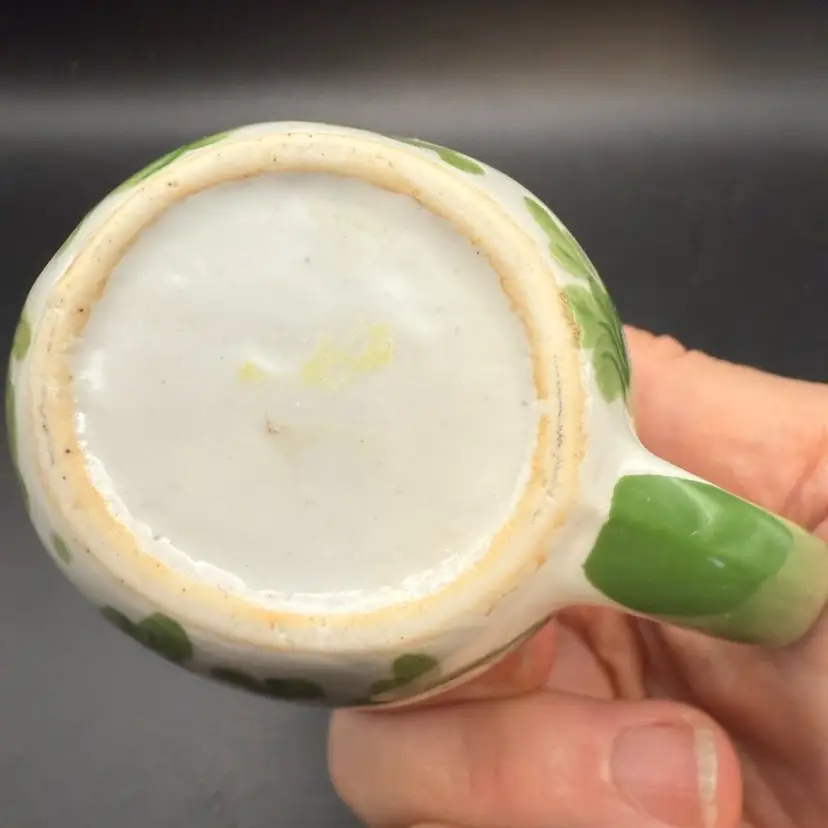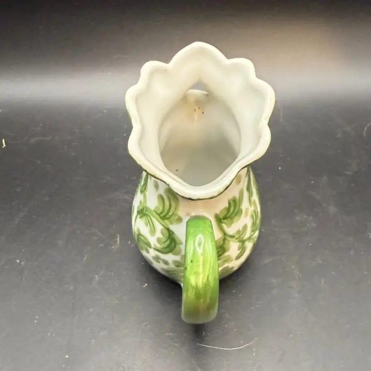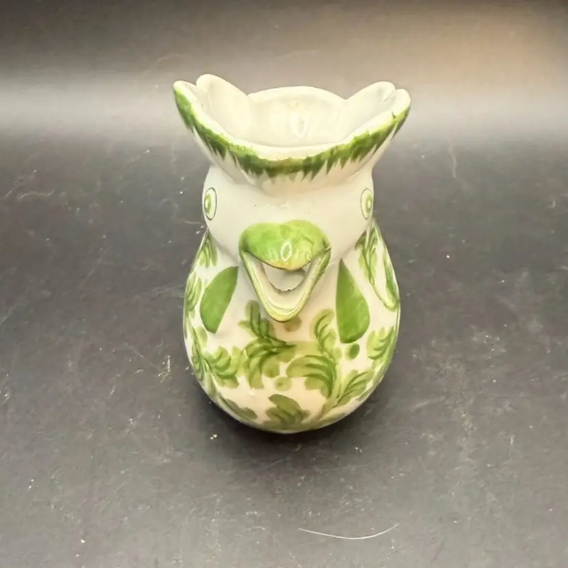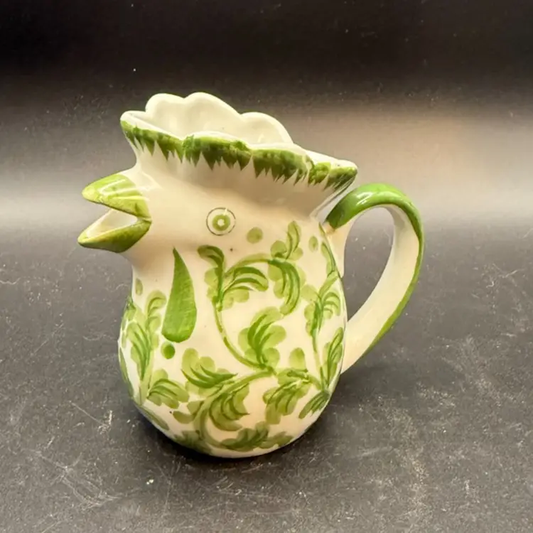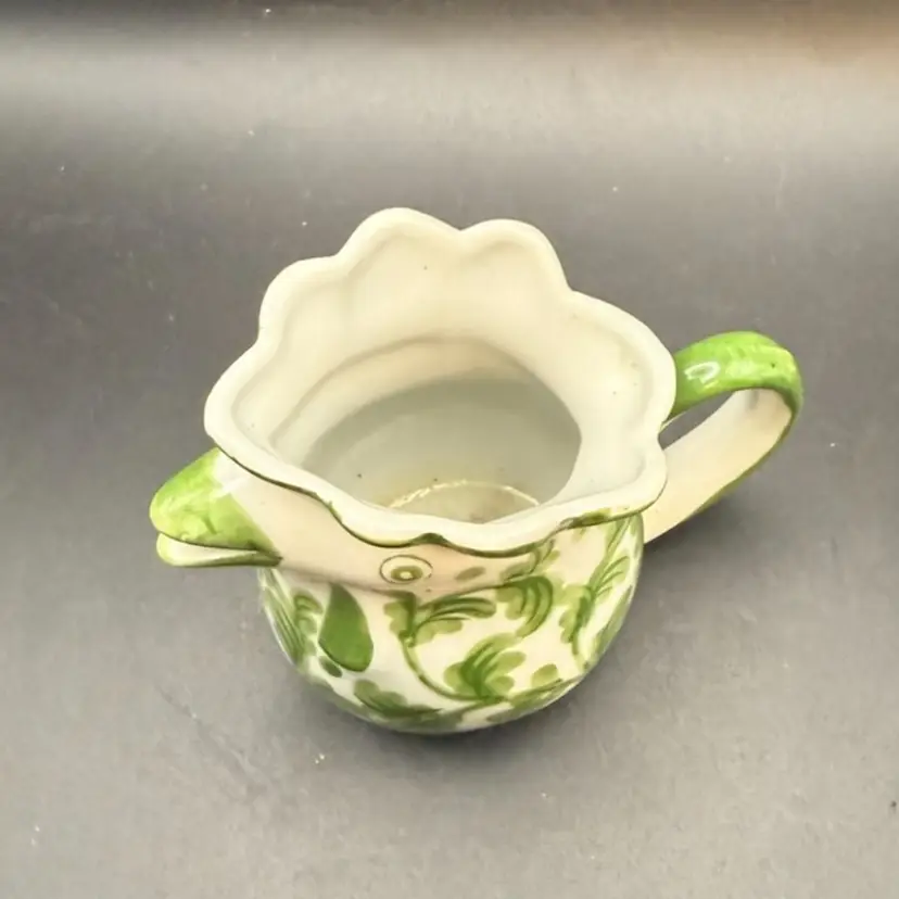 This creamer is shaped like a rooster or chicken, featuring hand-painted green floral accents and trim. It is made of porcelain and is considered a vintage item, likely from the 1980s. It is 3 in tall.