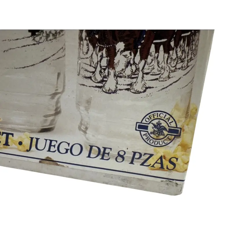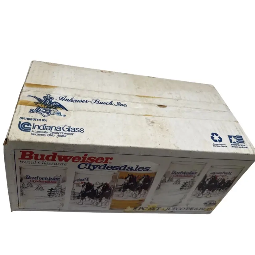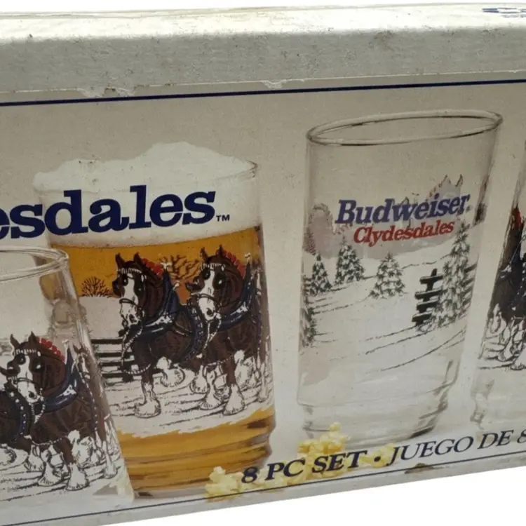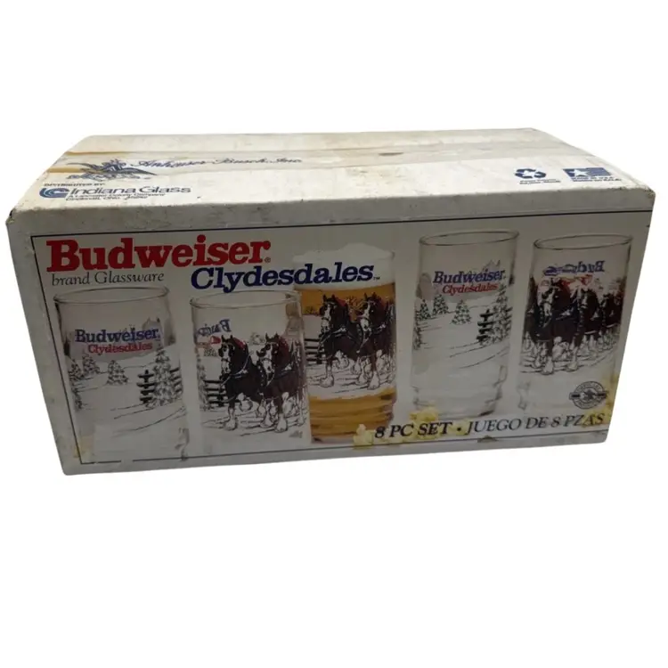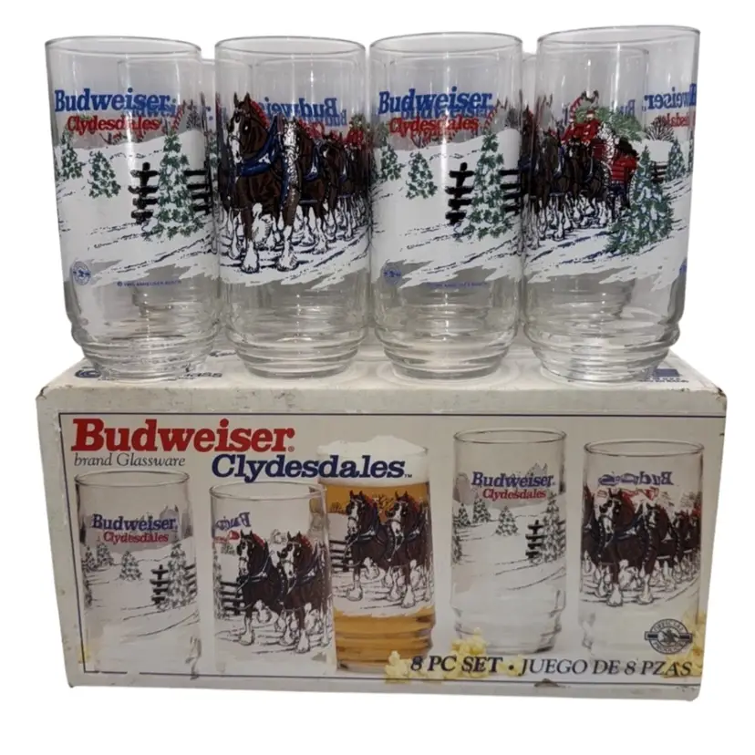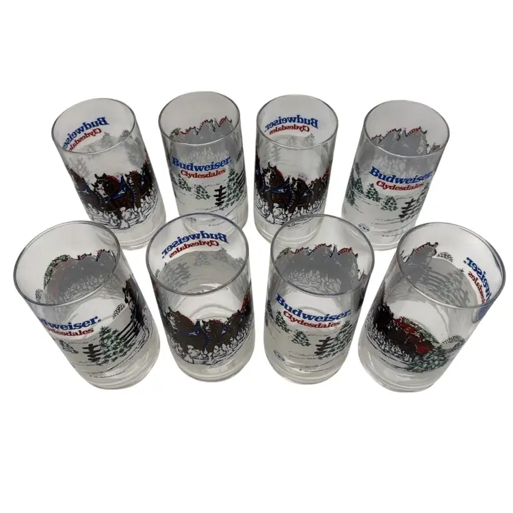 Vintage 1995 Set of 8 Budweiser Clydesdales Indiana Glass Coolers Christmas Themed