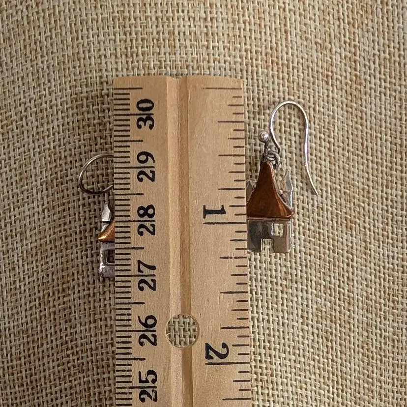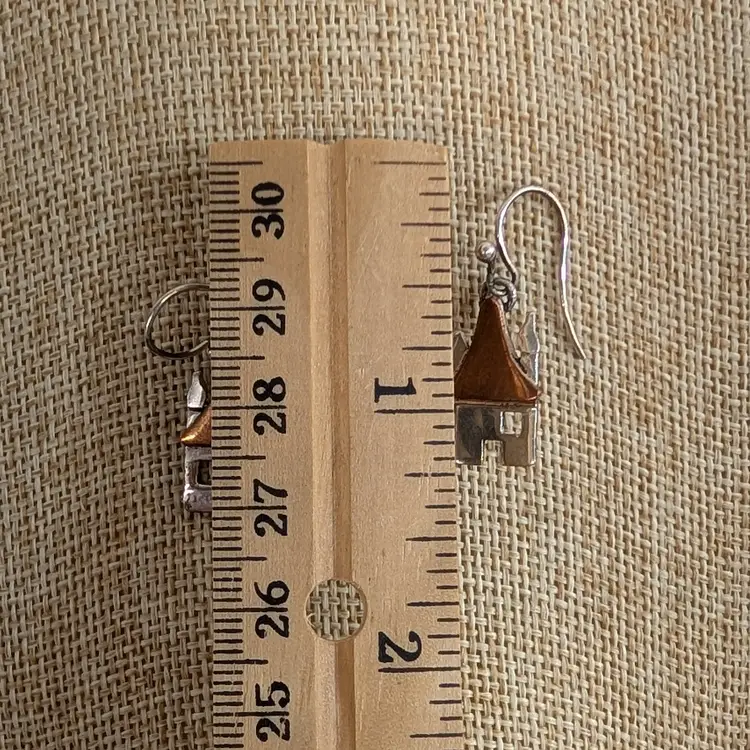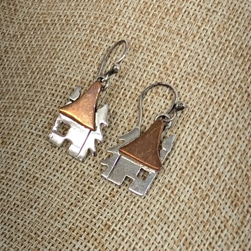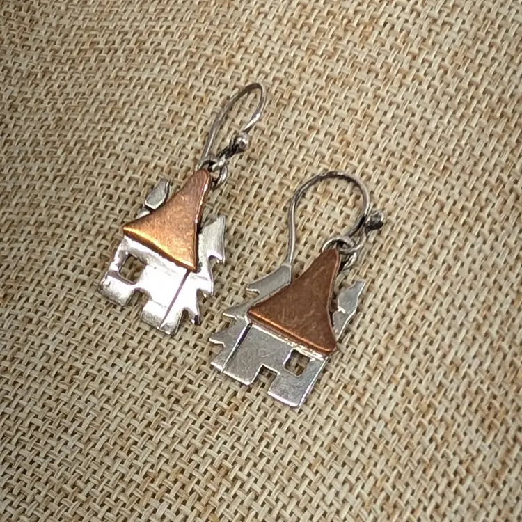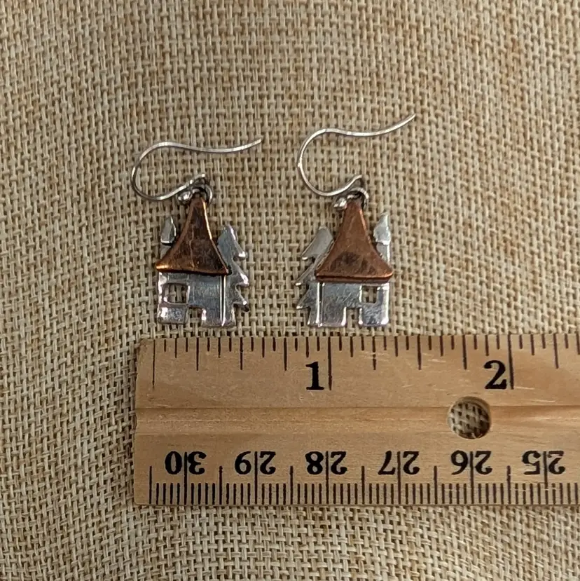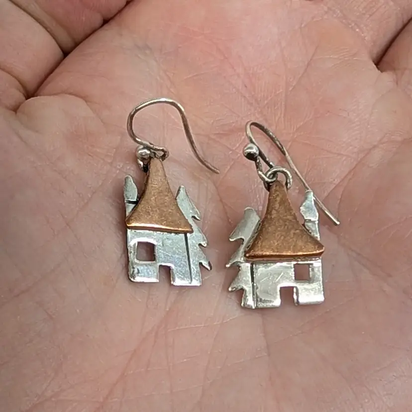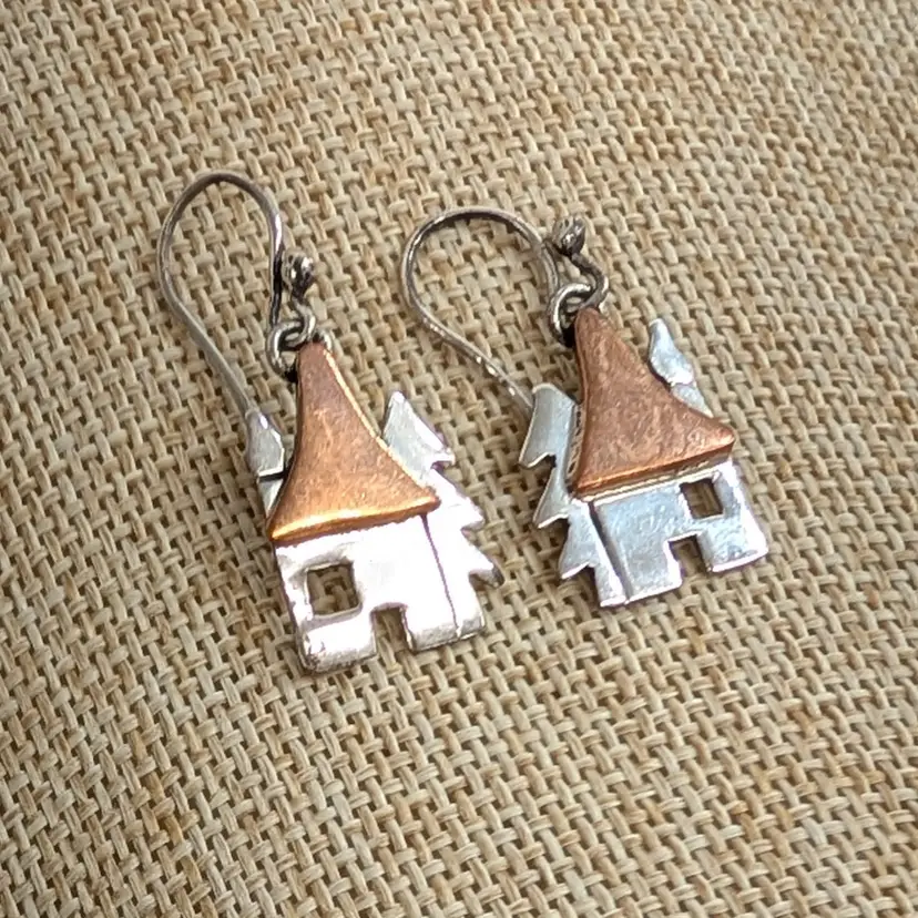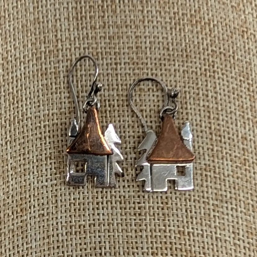 Adorable, mixed metal earrings from Anne Harvey Design. It is a sterling house and tree with a copper roof. In nice, used condition. Measurements ~ 1/2 x 1-1/4"
