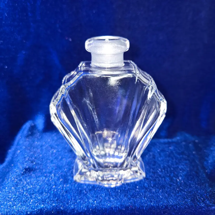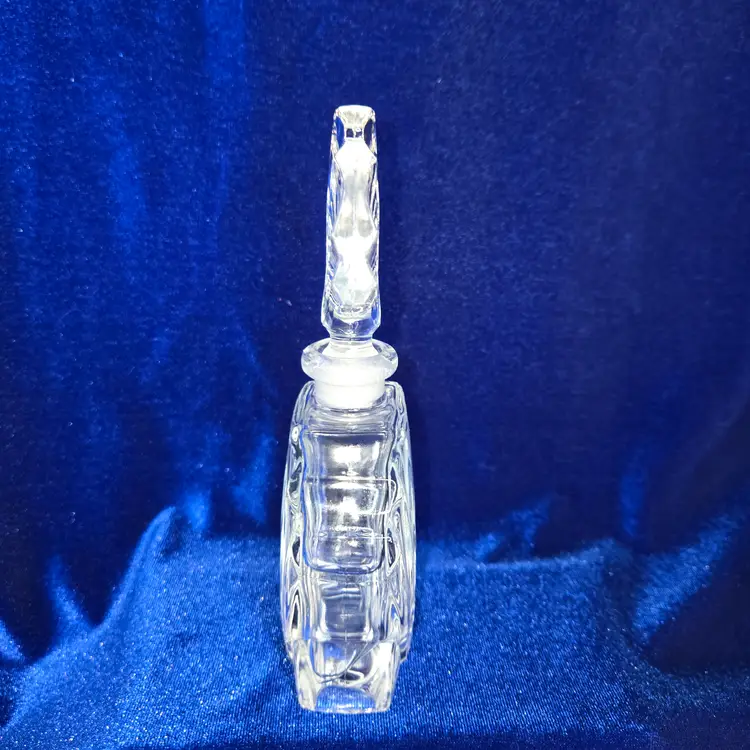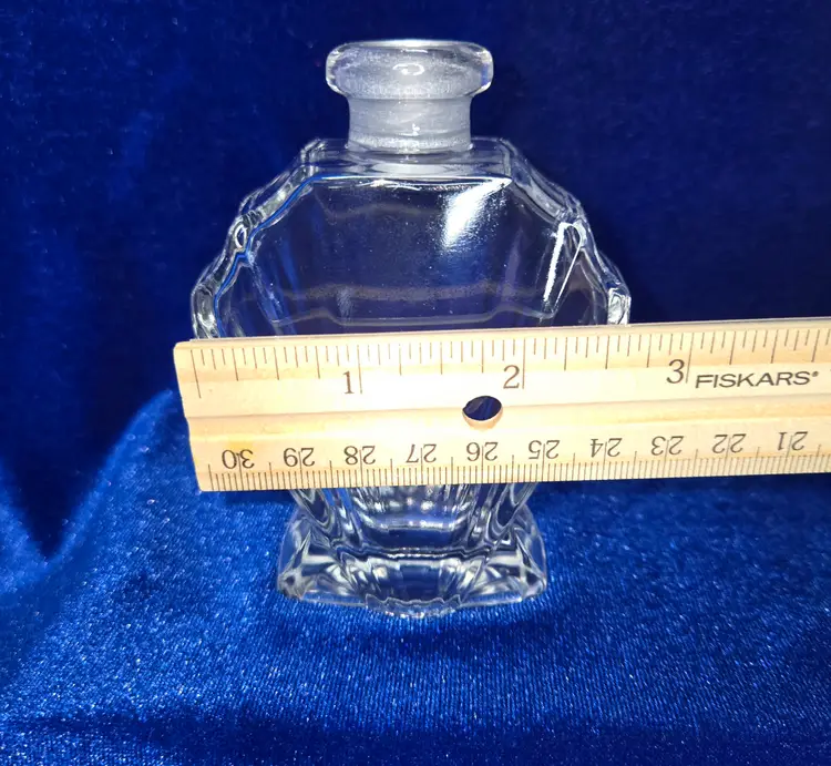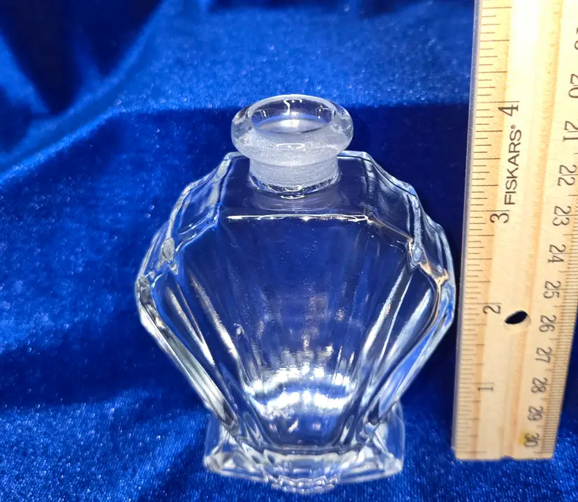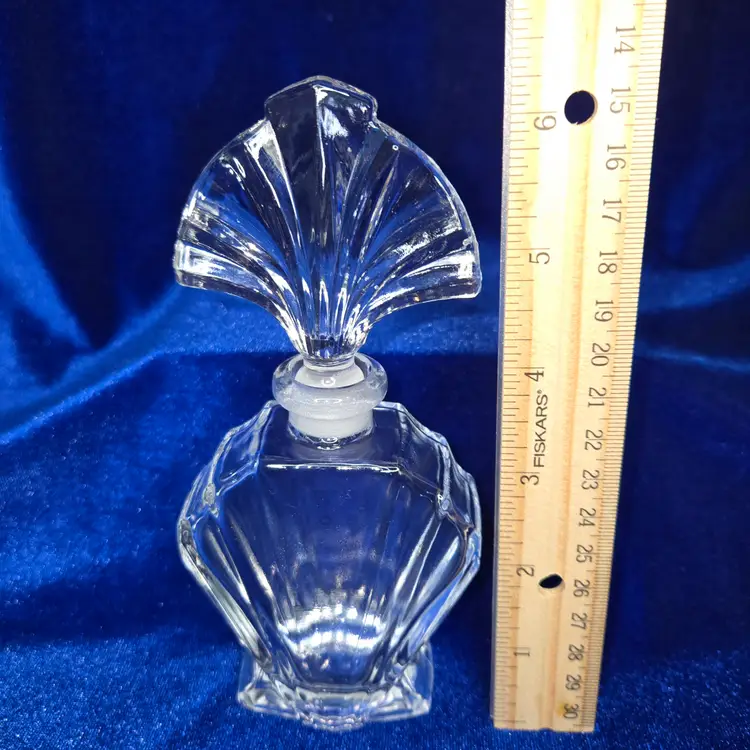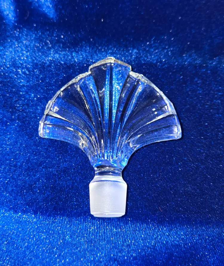Beautiful crystal perfume bottle (empty) with fan stopper. Glows green under UV 365. No chips, fleabites, cracks, or repairs. See pics for dimensions please. No odor or scent to bottle.
