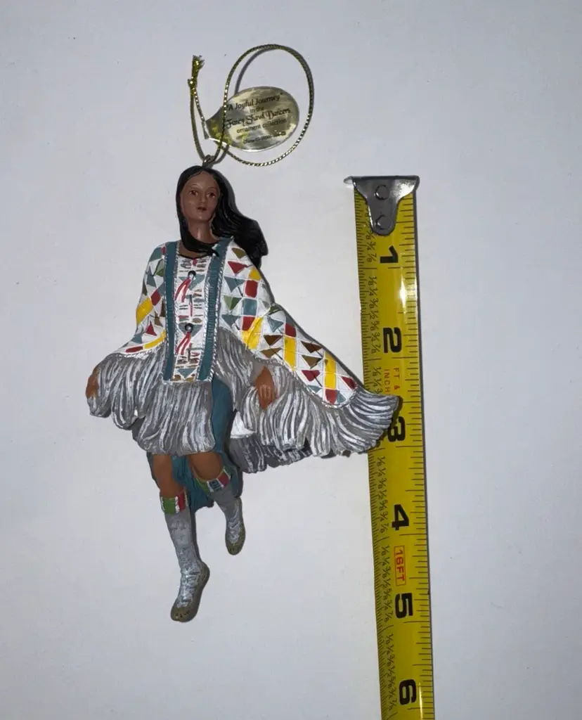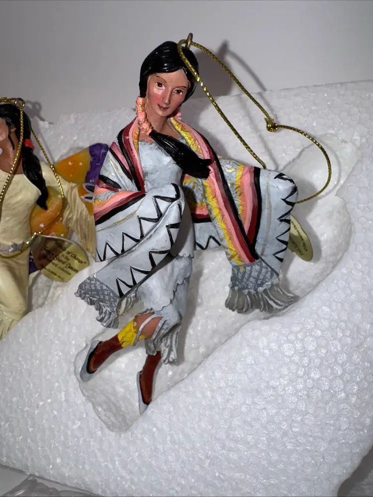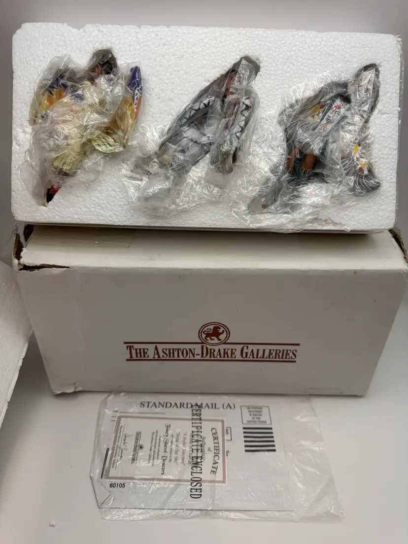The Ashton-Drake Galleries Fancy Shawl Dancers Ornaments set #4 includes three specific hand painted ornaments: "Winds of Change," "A Joyful Journey," and "Song of the Sky".