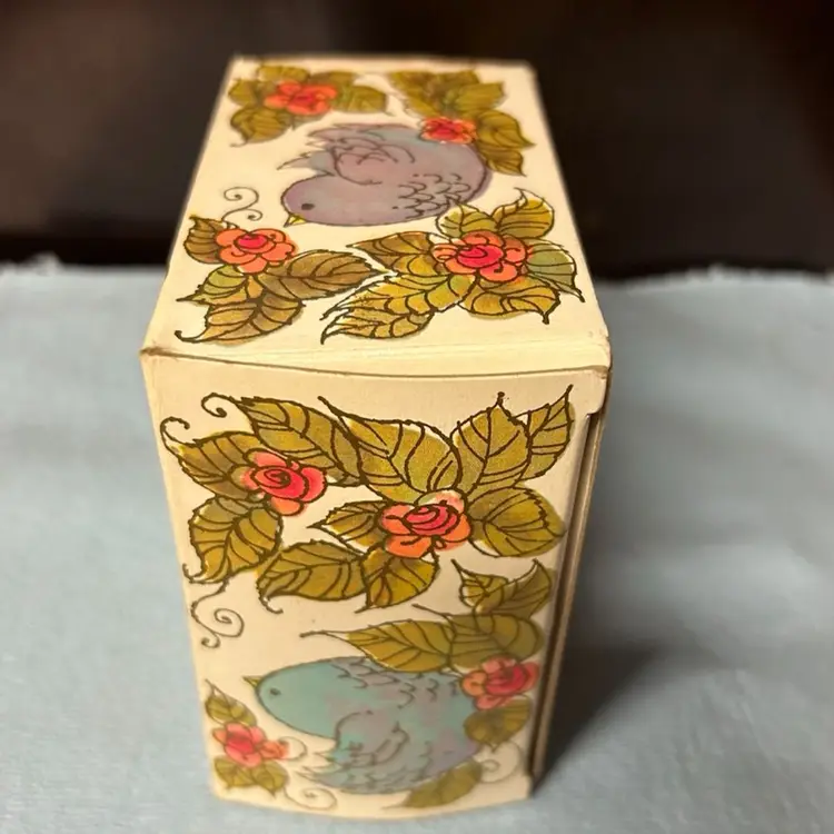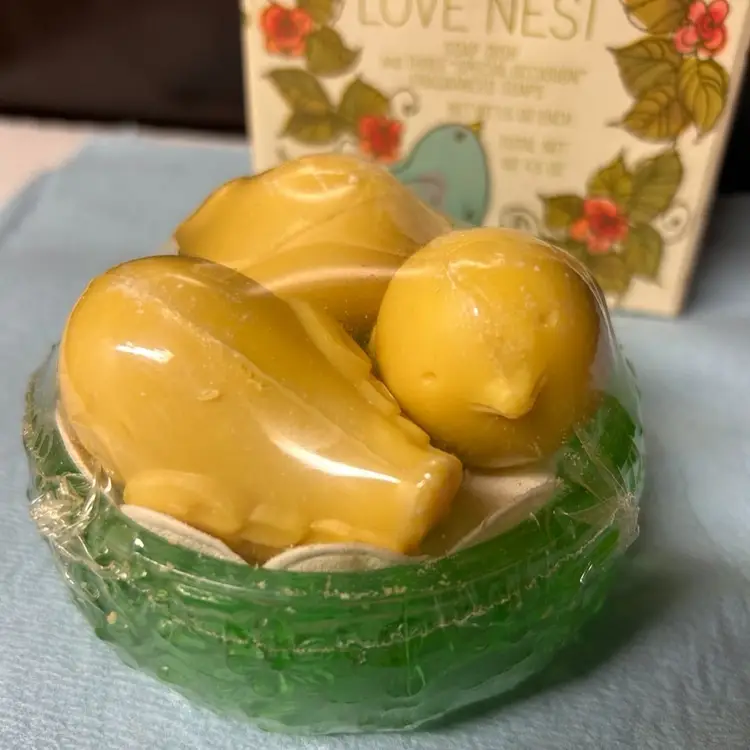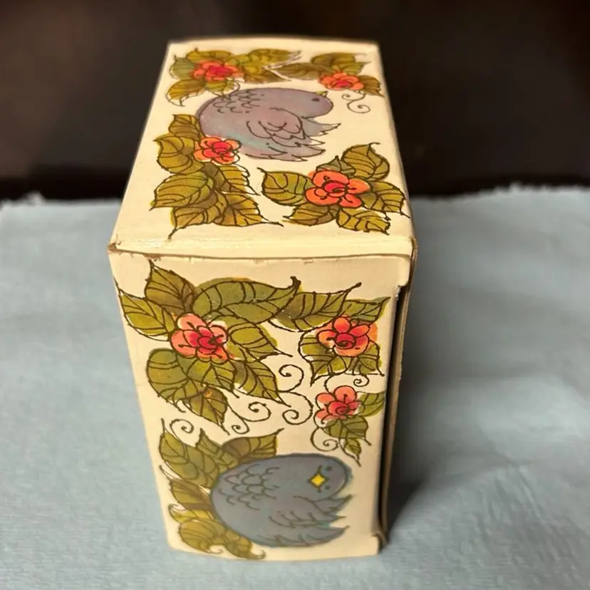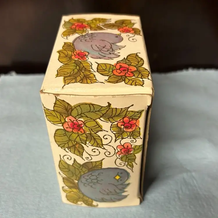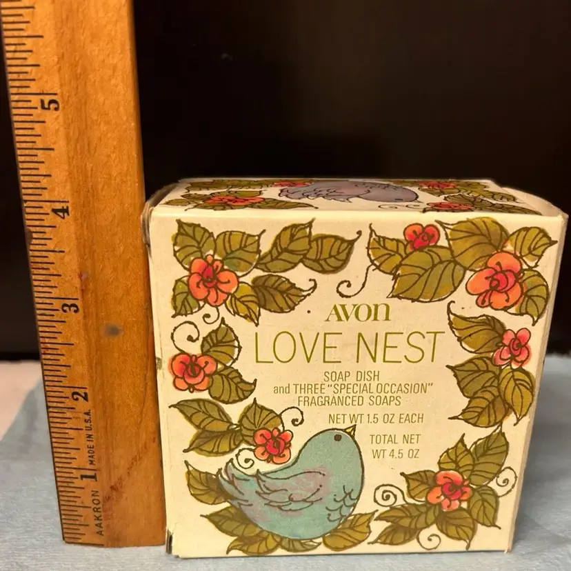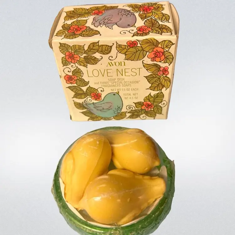 This vintage Avon set is still in its original box with its cellophane wrapper around the soaps and glass dish. The box measures approximately 4 inches tall. Good condition for all.