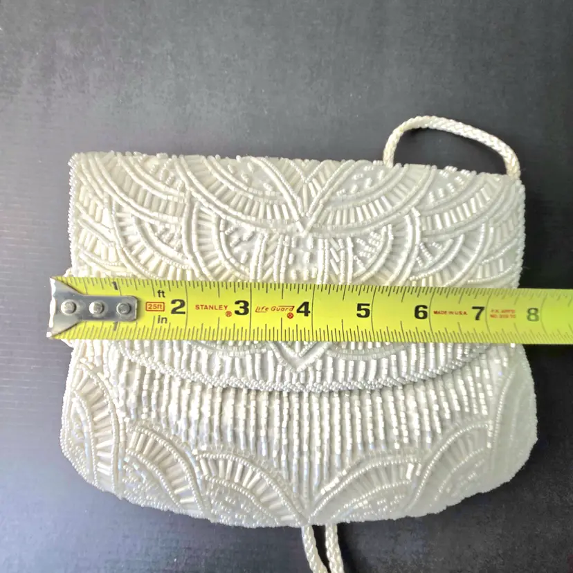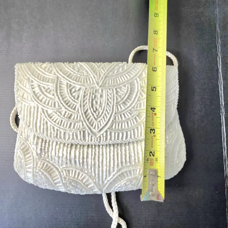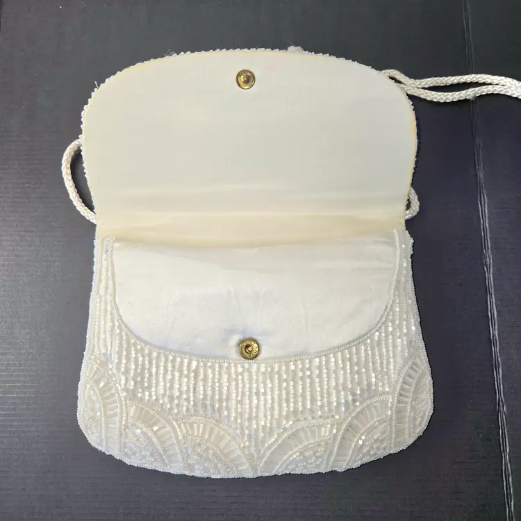 Beautiful little evening bag fully beaded. Satin Interior. Carry as clutch or shoulder bag or crossbody. Has Inner Pocket. Handsewn in Macau. No missing beads. Minute stain on strap .