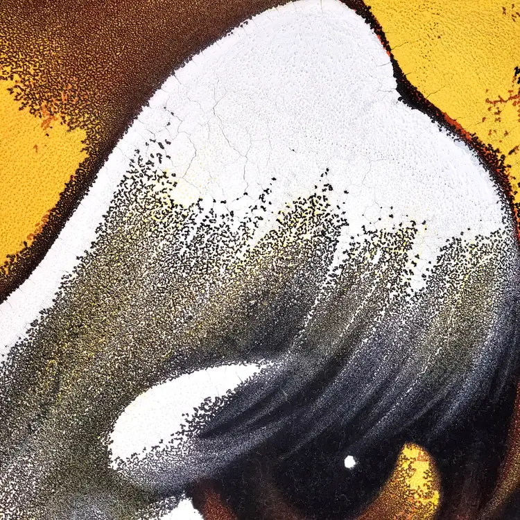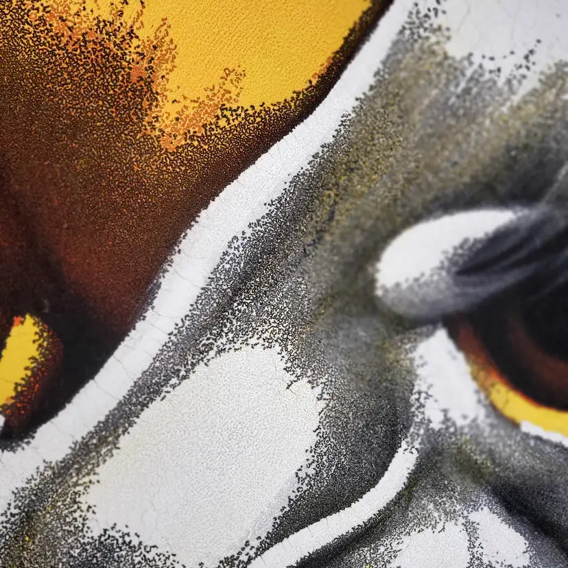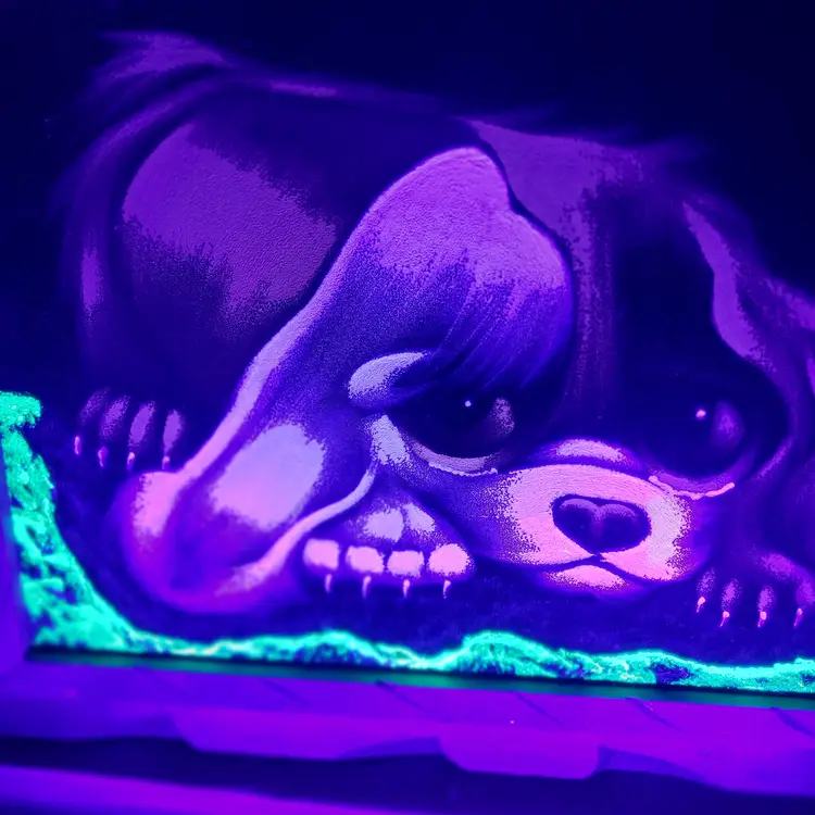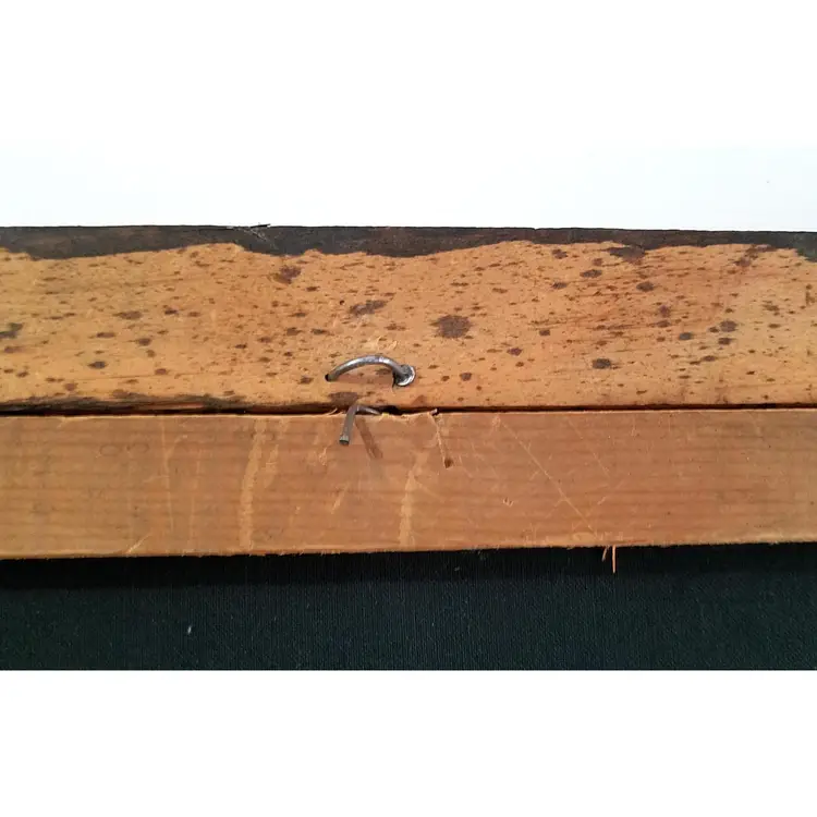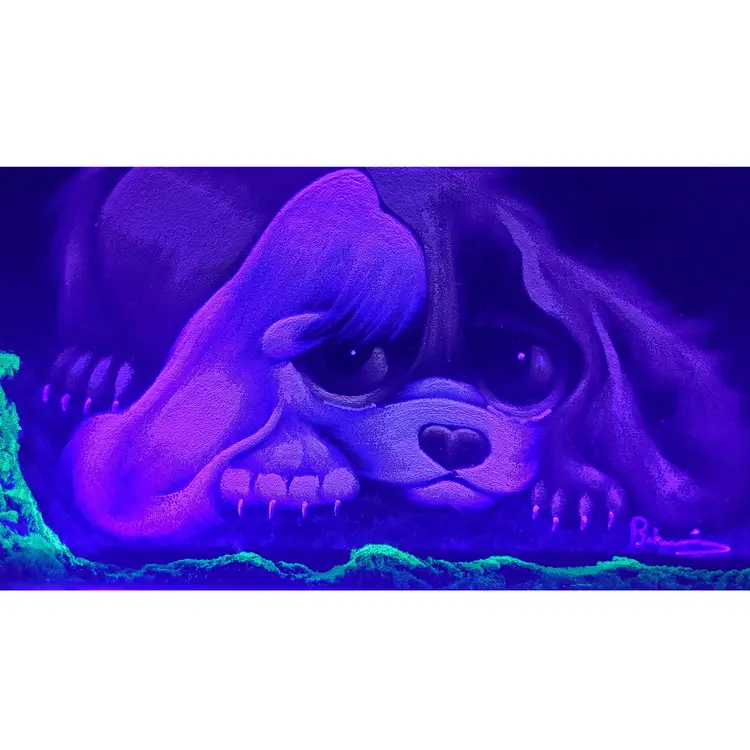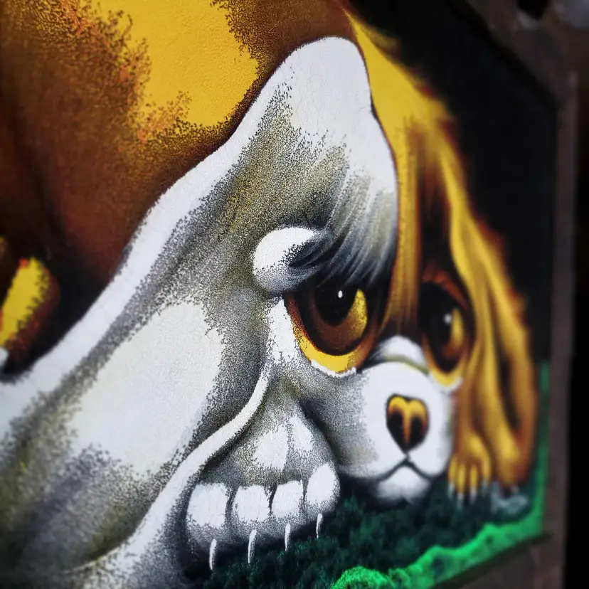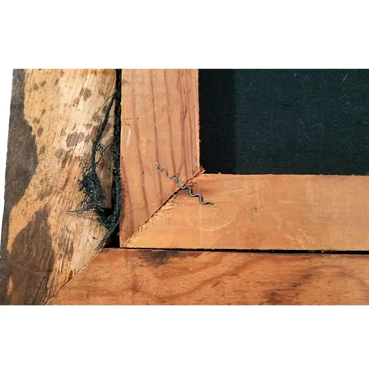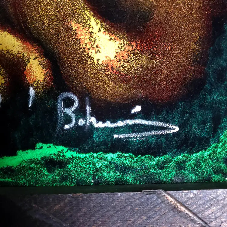 The soulful expression of this little pooch is sure to tug at the heartstrings and make a whimsical addition to any room. This vintage painting shows some signs of age and wear in some cracking of the paint and a couple of scrapes on the frame. Please examine photos. It also needs a couple of nails to just stabilize the picture inside the frame. Not a big deal. It looks good under black light as well, with the green giving a very vivid pop. Enjoy this piece of groovy 70s kitsch today! Thanks for looking!