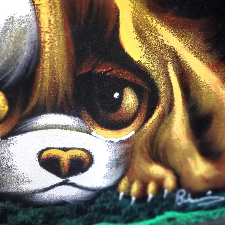 Vintage Big Eyed Sad Puppy Velvet Painting in Rustic Wooden Frame, Signed