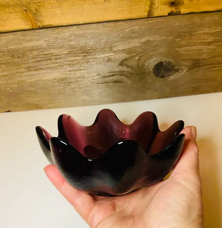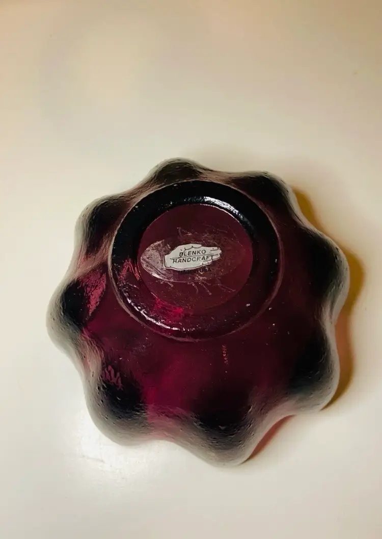 This is a collectable amethyst lotus small petal bowl by Blenko. The piece is hand blown with a similar intensity of color. Original maker's sticker on bottom. It is a beautiful purple. In good used condition. No chips or cracks. A couple bubbles in the glass.