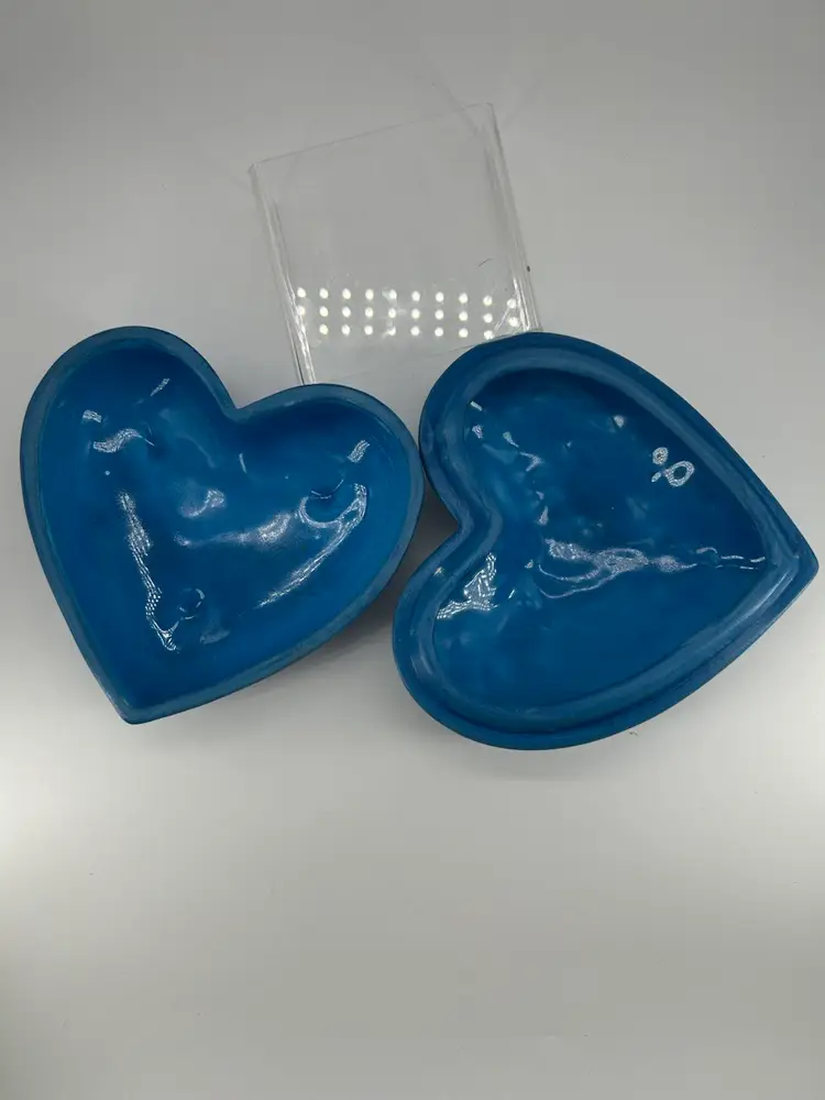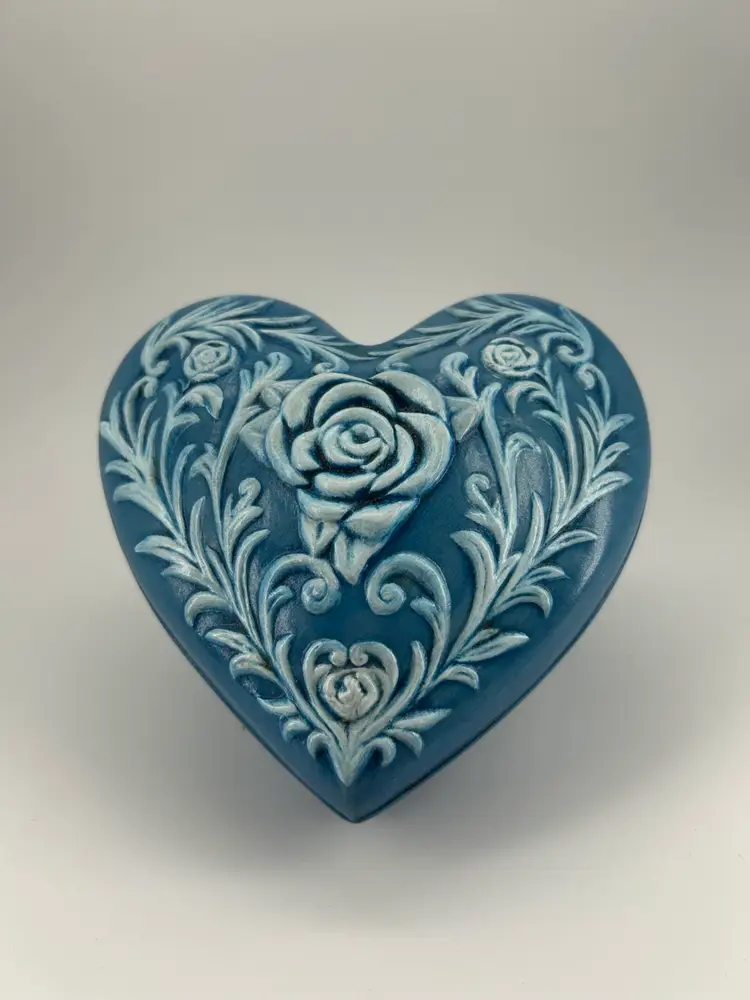 This is a pretty heart shaped trinket box made of ceramic with raised floral patterns. it stands about 3 inches tall and 5 inches across. There are no chips or cracks.