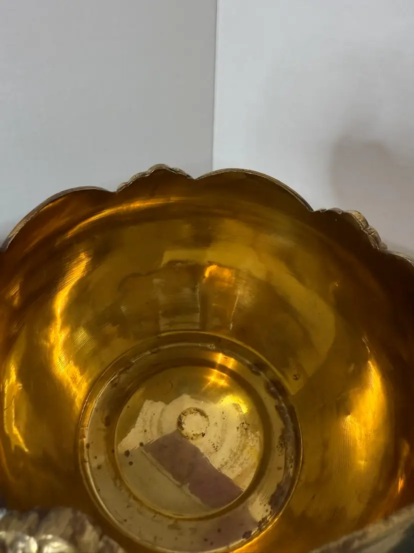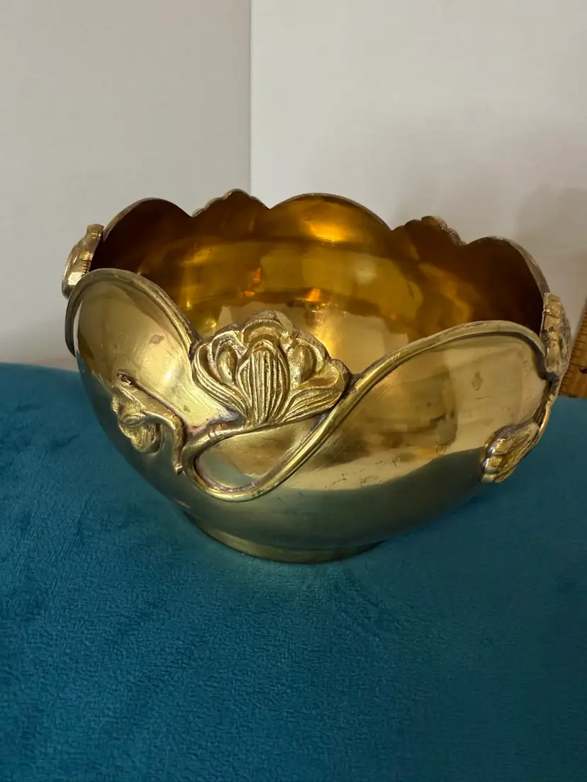 The decorative elements include detailed, hand-etched or embossed floral and leaf patterns that encircle the bow Beautiful golden tone with natural patina. 6”x4.5” No dents or chips. Some scratches consistent with vintage brass. Planter, bedside dish, entryway catchall, or decorative accent