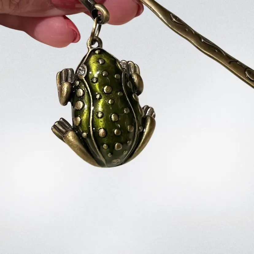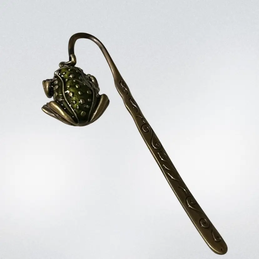 18. VINTAGE BRASS BOOK MARKER WITH ENAMELED Frog Rhinestone Eyes