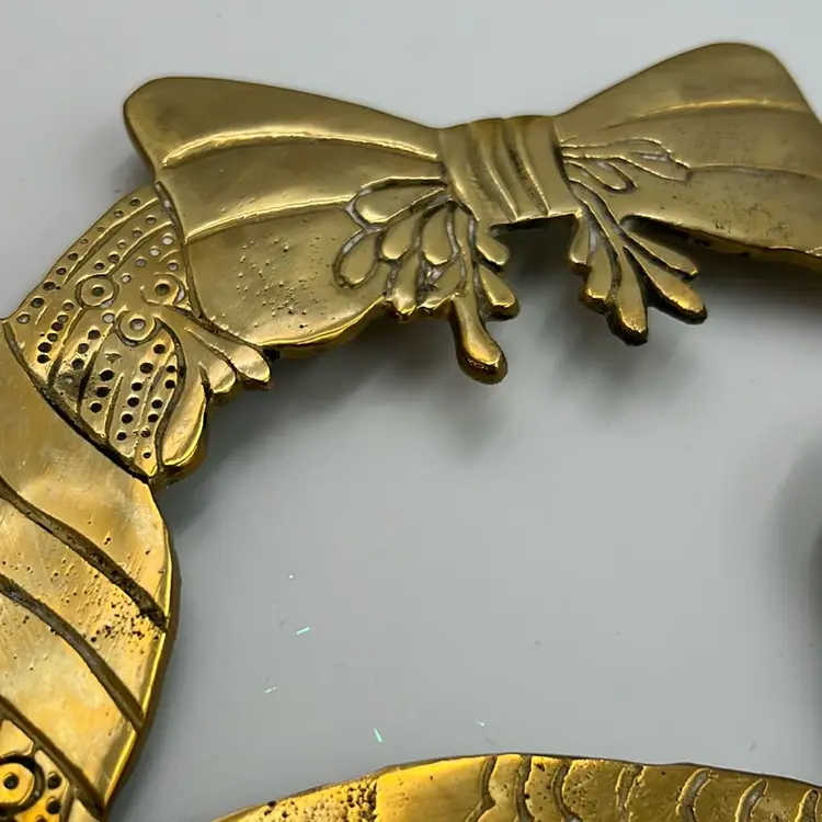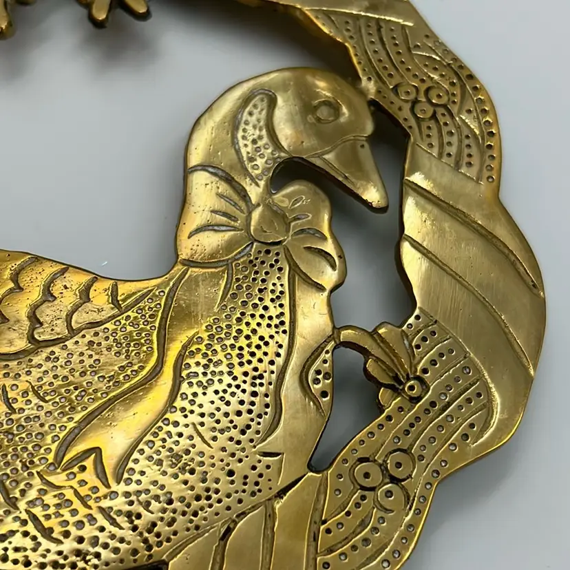 Carved brass wreath with a bow and a goose! Some vintage wear.