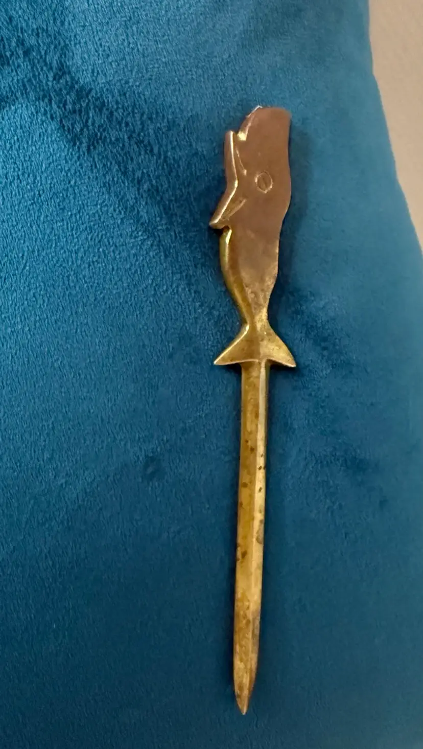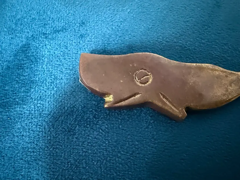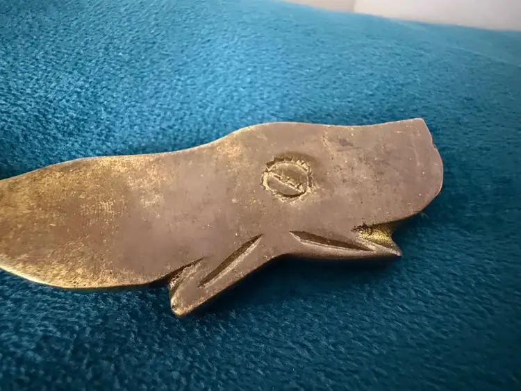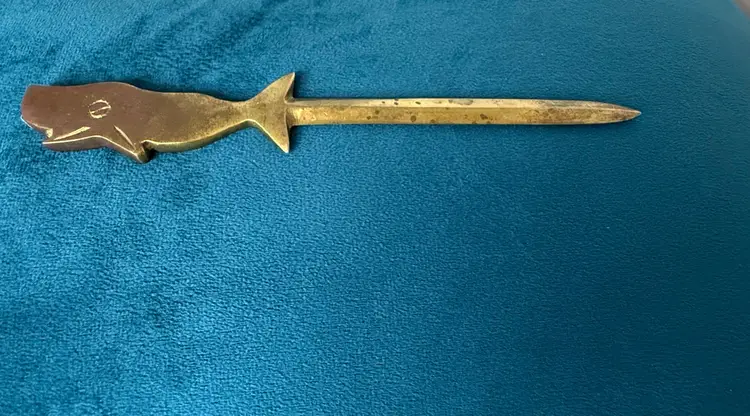 Vintage solid brass letter opener featuring a whale design at the handle. Nautical-themed and hand-finished with natural patina. Coastal décor piece or functional desk accessory. Great vintage condition.
