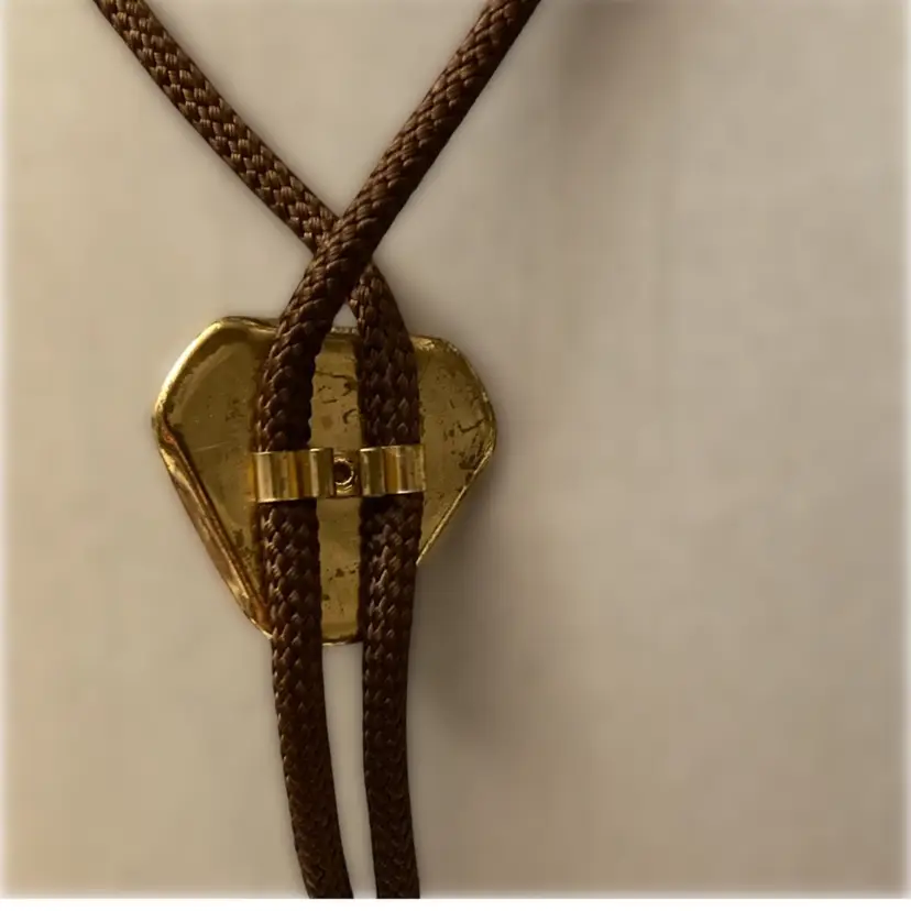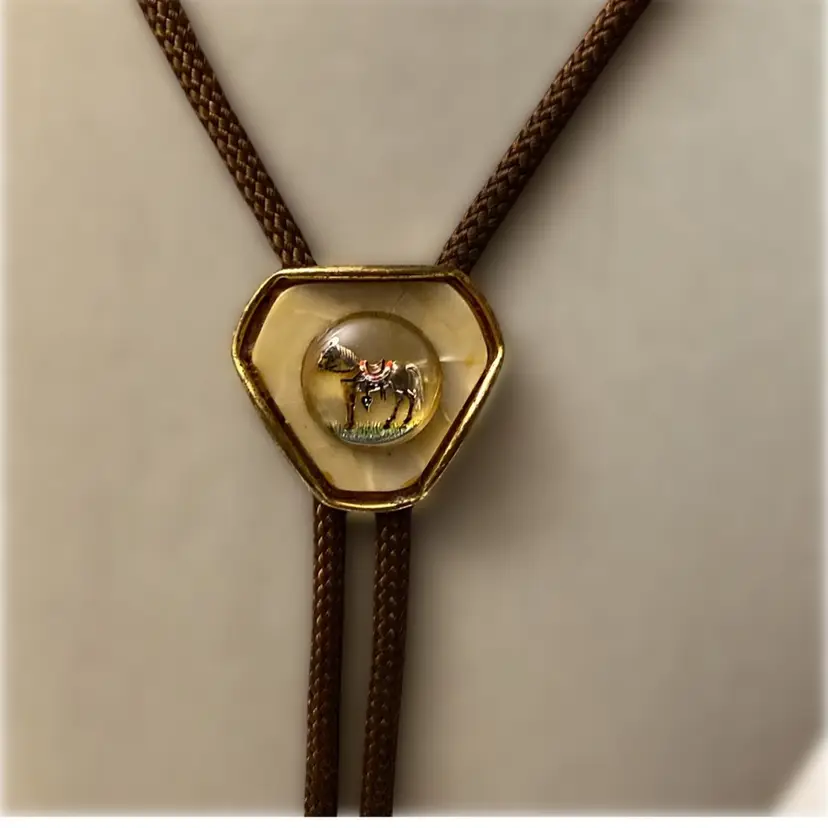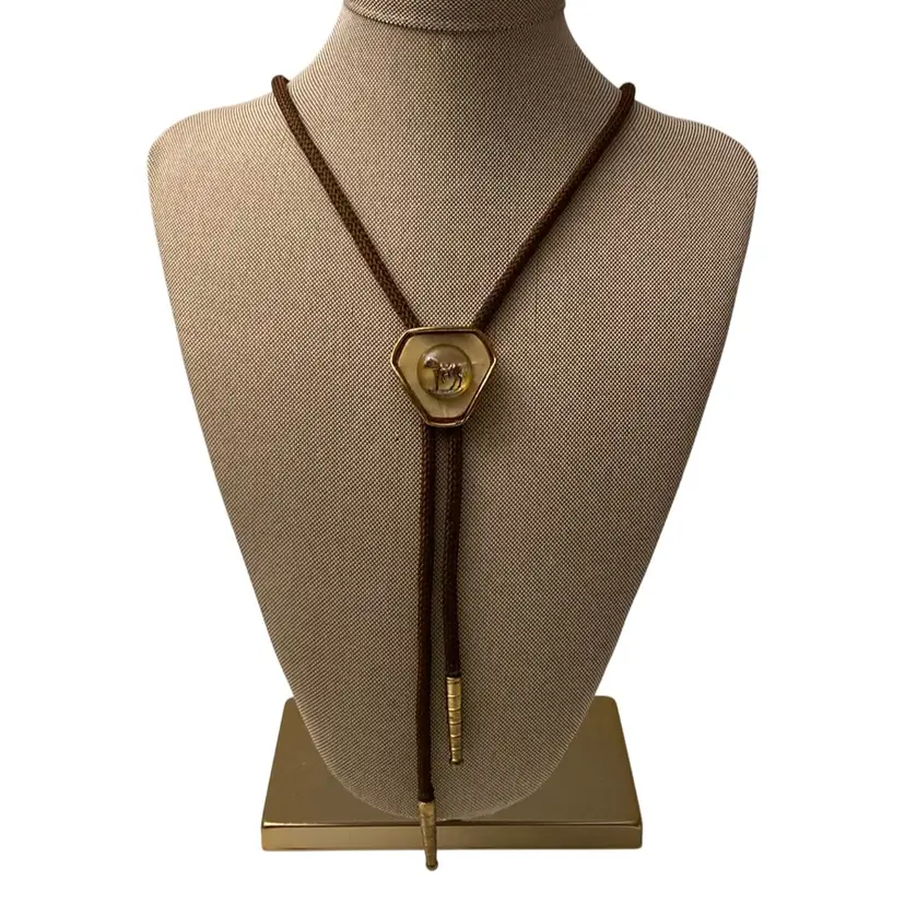 Vintage brown cord bolo tie with gold Western horse bolo. The bolo measures 1 1/4” x 1 1/3”. The cord tie measures 32” long with gold tone metal tips.