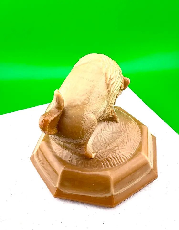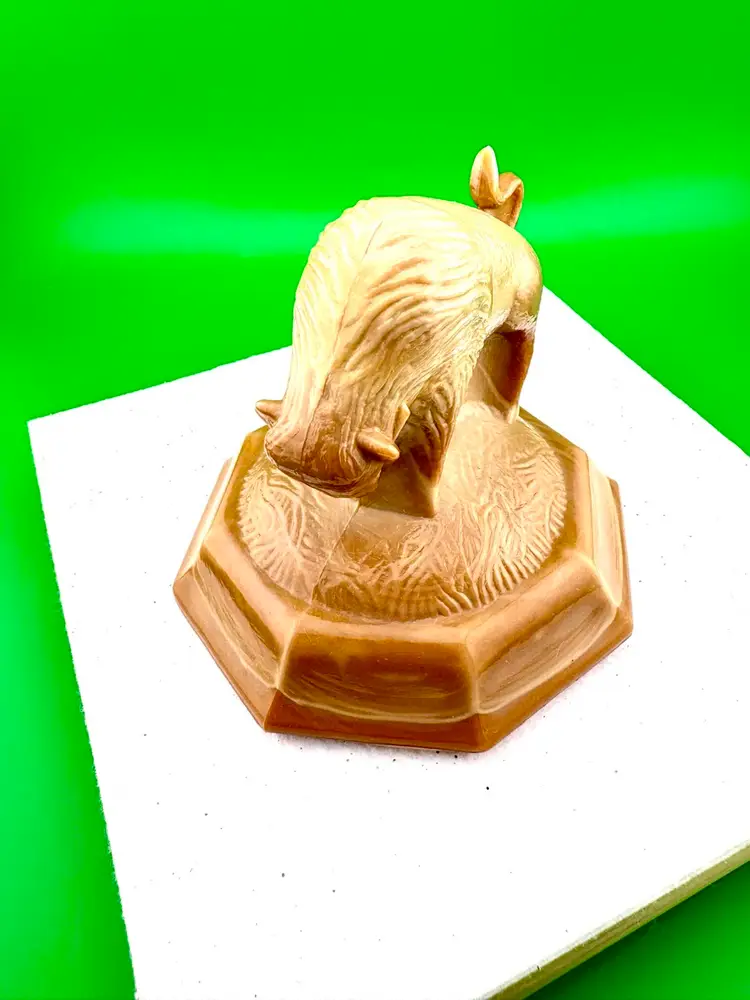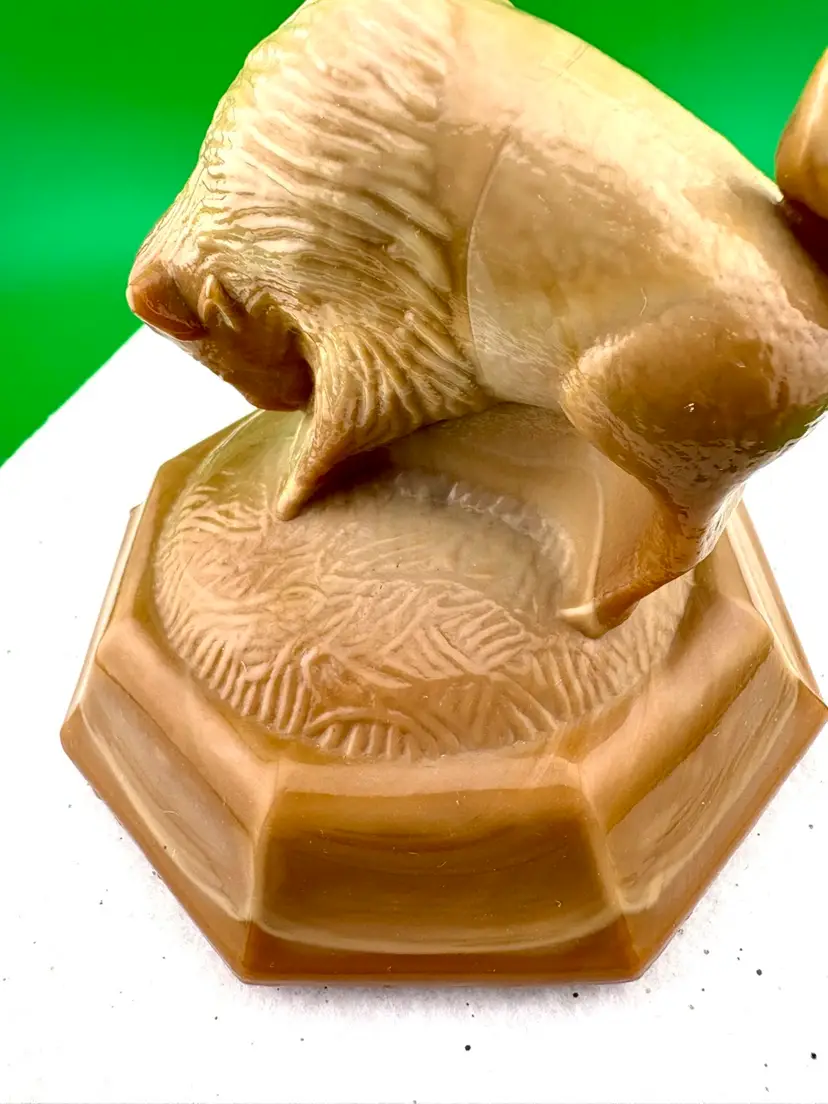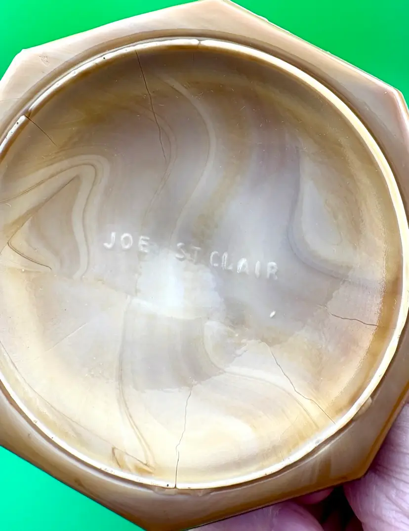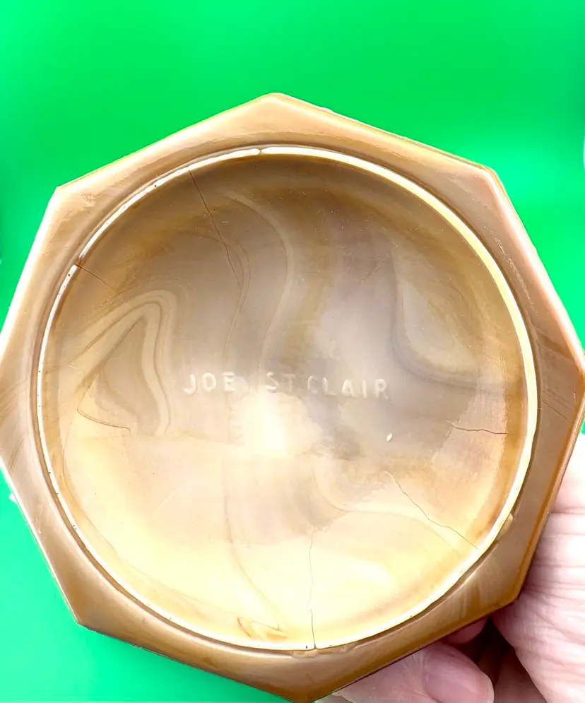 This is a stunning piece by Joe St Clair. It looks caramel colored. In good condition with no chips or cracks.