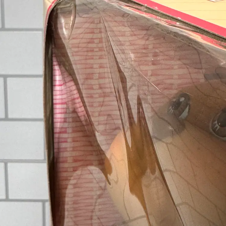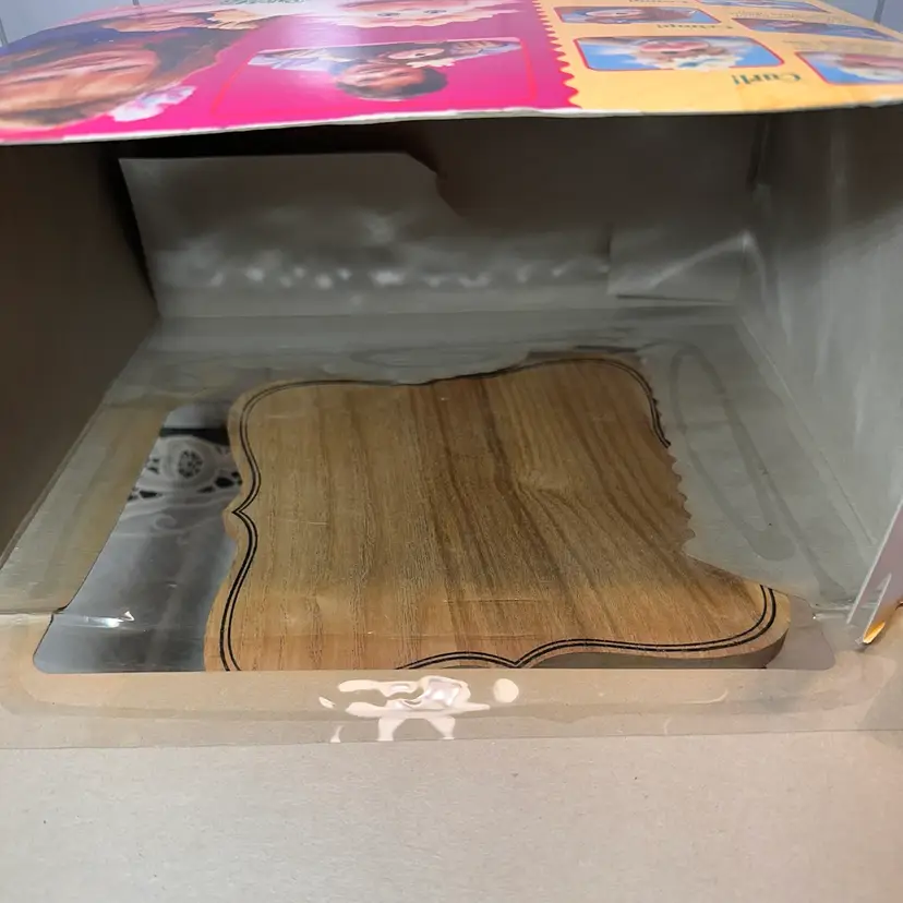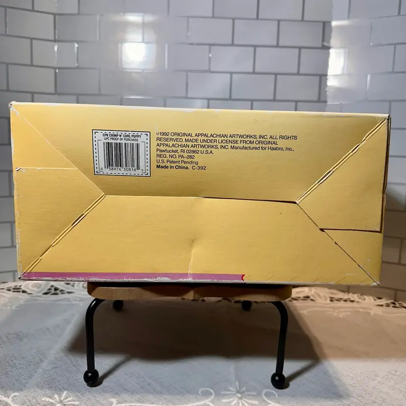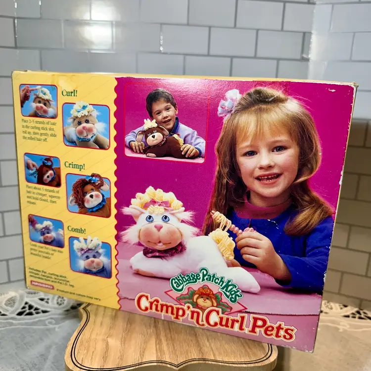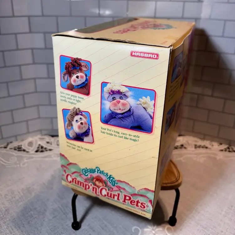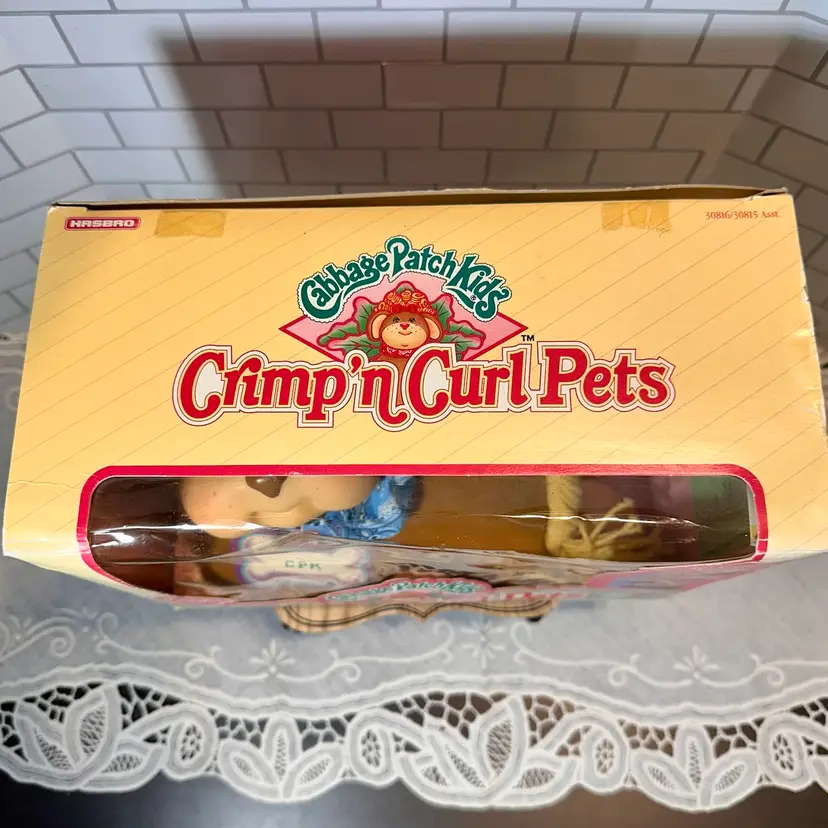 This 1992 vintage Cabbage Patch Kids Crimp ‘n Curl Pets Puppy is named Max. The comes in its original packaging, which has been opened. The doll and crimper have never been off the card, but rubber bands holding the curling stick and comb have disintegrated over time. I have replaced these to hold those two accessories onto the card. Please refer to pictures for details including a gap in the plastic sheeting window due to glue separation. There are also tape marks and creases in the packaging.